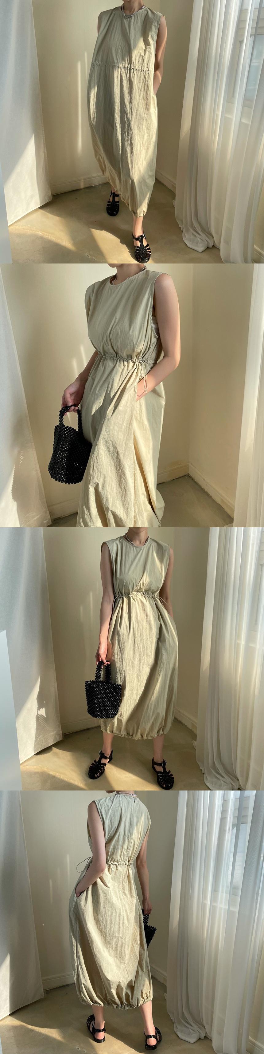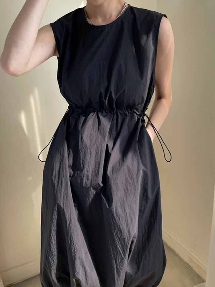 [EWQ] ドローストリングウエストタンクトップドレス無地 O ネックノースリーブカーキドレス夏 Vestido 16Y8194 サマー 夏物 Oネック ソリッドカラー