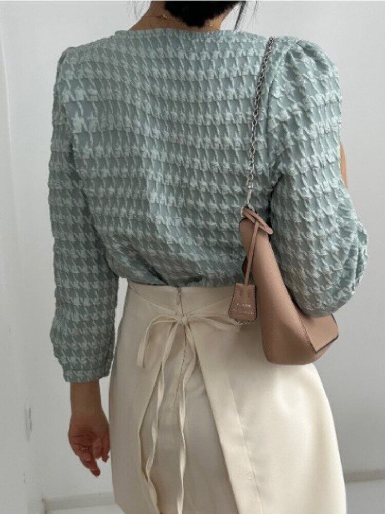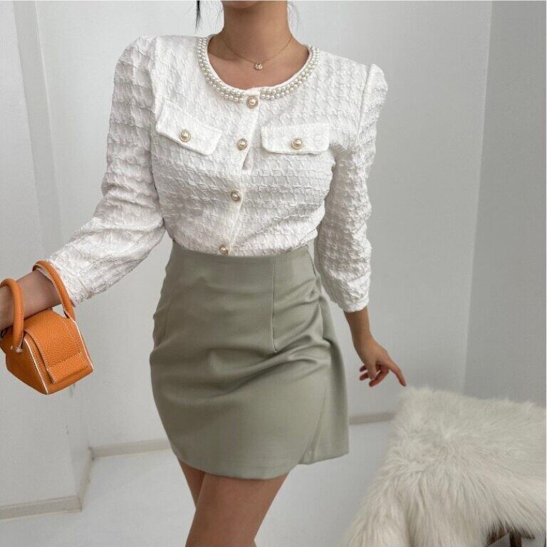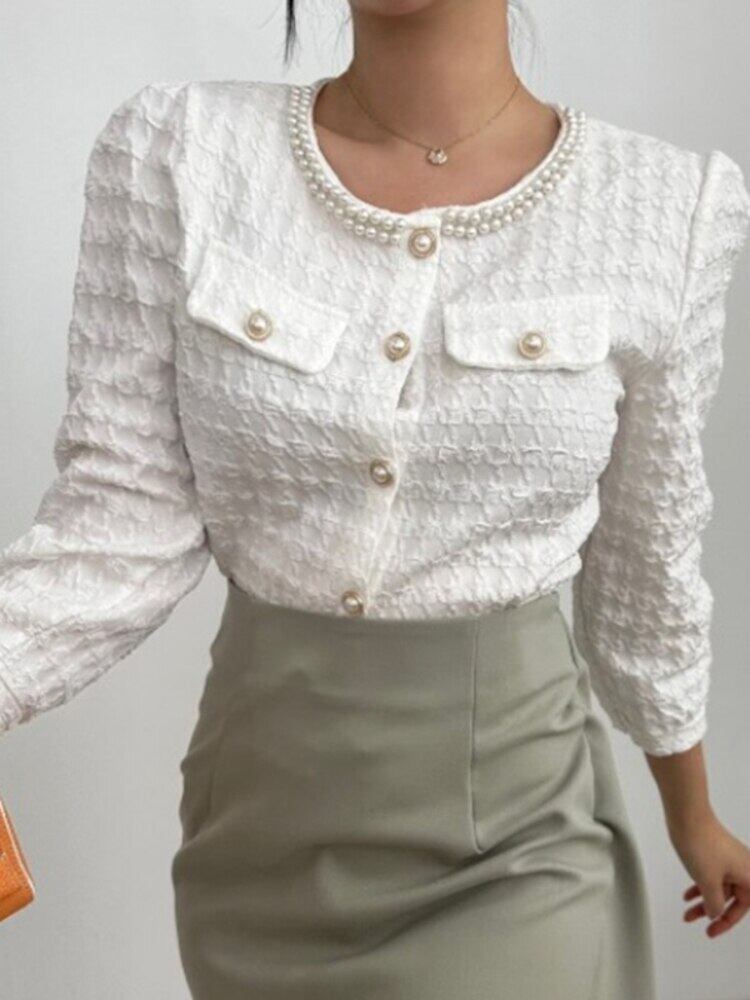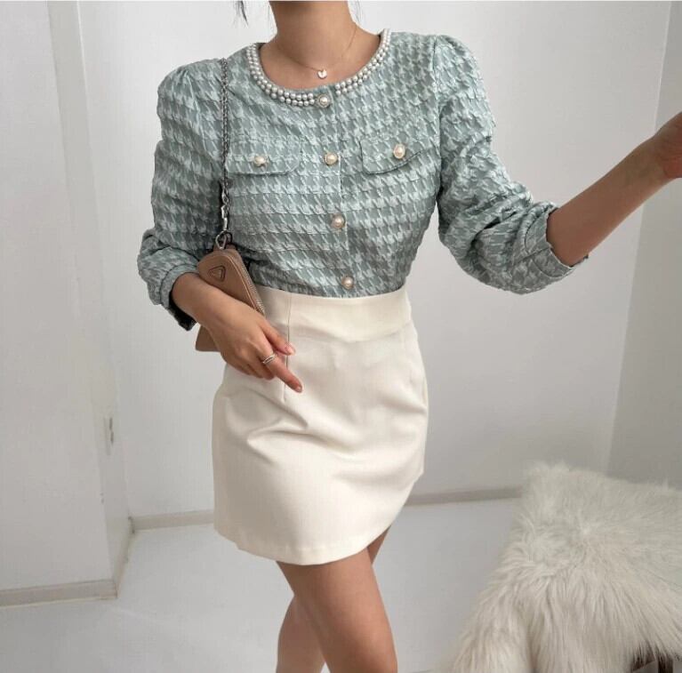 [EWQ] O ネック パール ボタン チェック シャツコントラスト カラー長袖ブラウス トップ春秋トップス 16Y7456 ロング スプリング 春物 オータム 秋物 Oネック 真珠