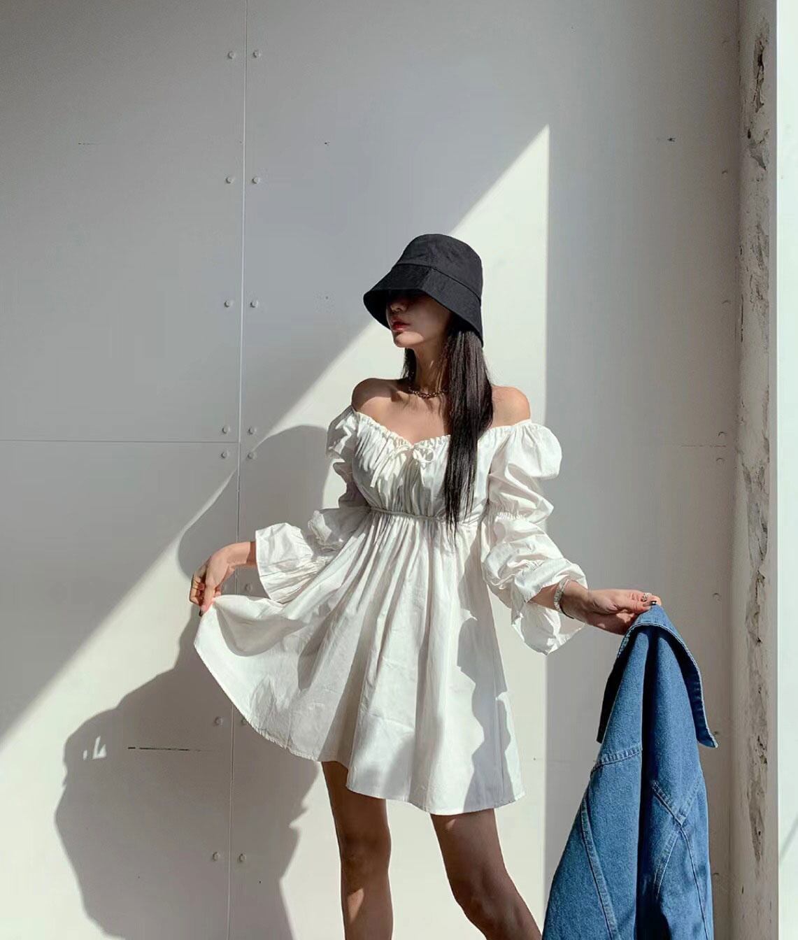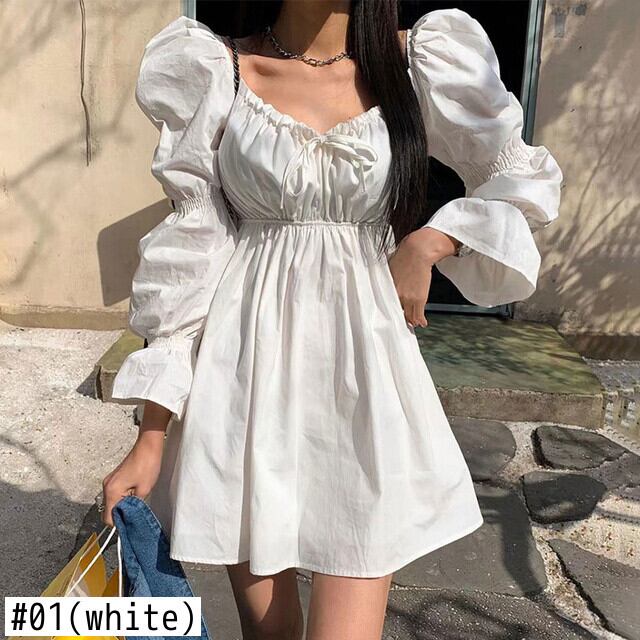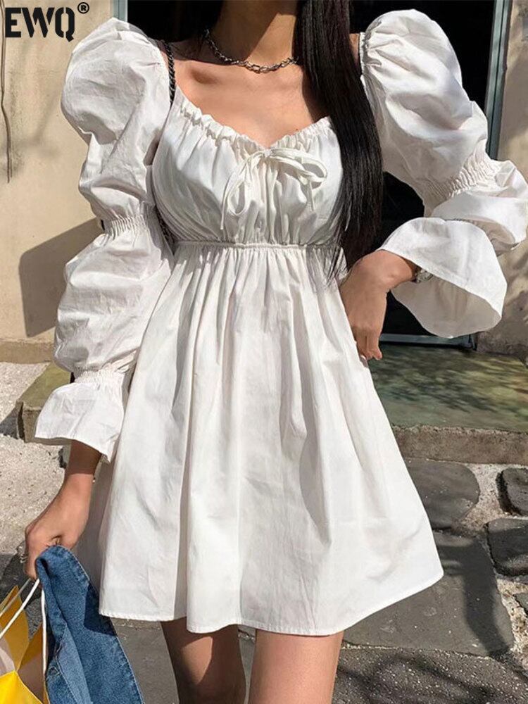 【EWQ】スクエアネックレースアッププリーツドレスフレアスリーブ無地ミニドレス夏潮Vestido Y7298 サマー 夏物 ソリッドカラー スクウェア