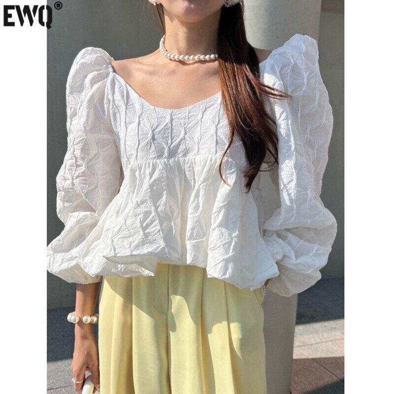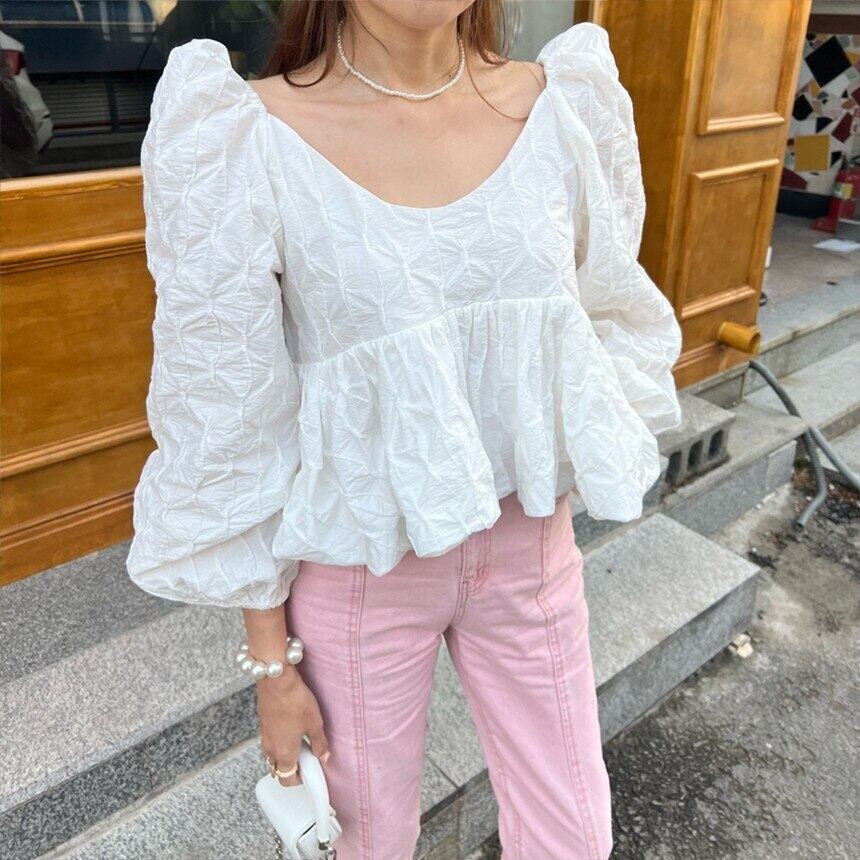 [EWQ] U カラー無地ランタンスリーブシャツフリルスプライストップ春秋ホワイトトップス Y7052 スプリング 春物 オータム 秋物 ソリッドカラー
