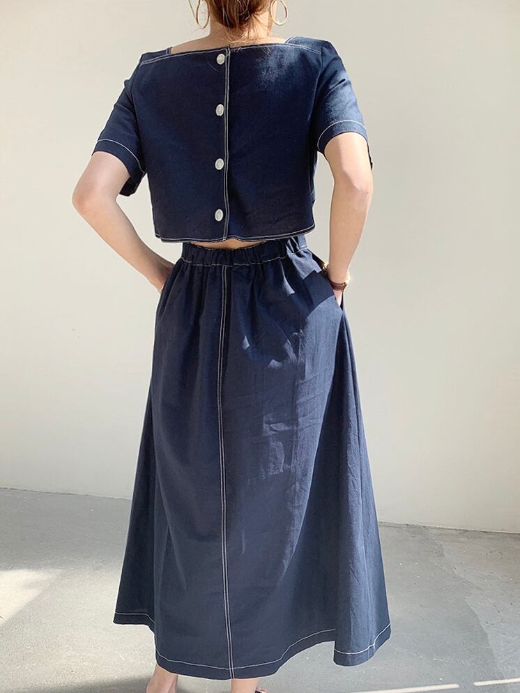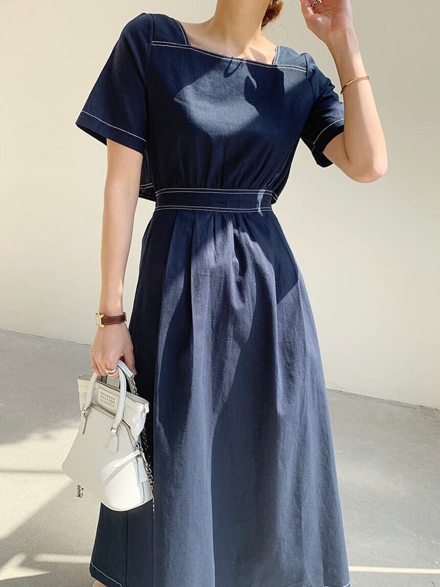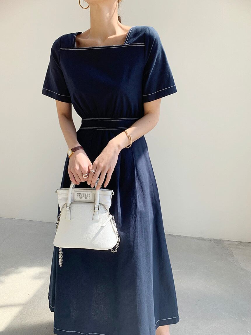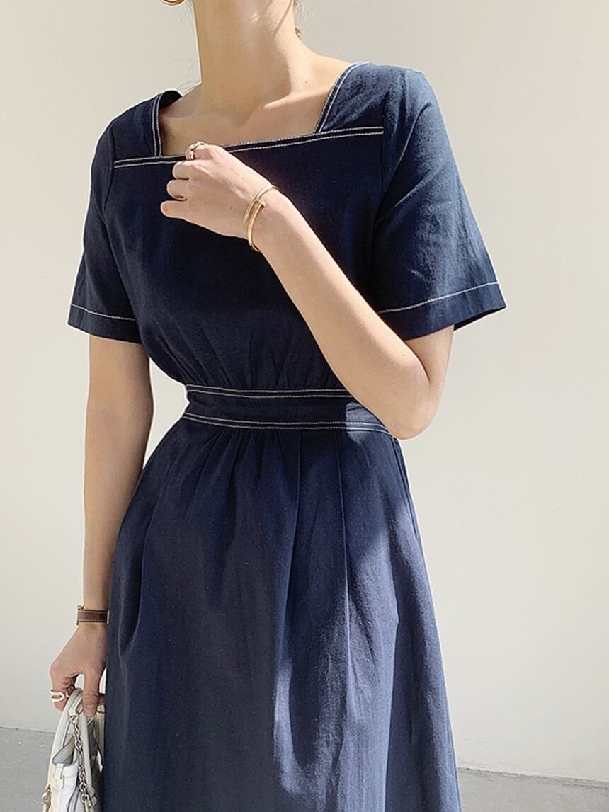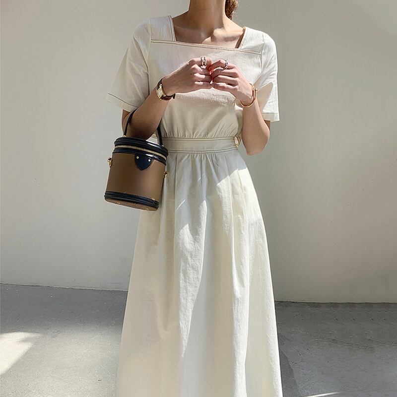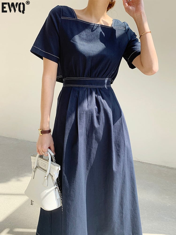 [EWQ] スクエア ネック プリーツ ドレス バックレス シングル ブレスト ドレス サマー ライン コントラスト スリム Vestido 16Y7255 夏物 スクウェア
