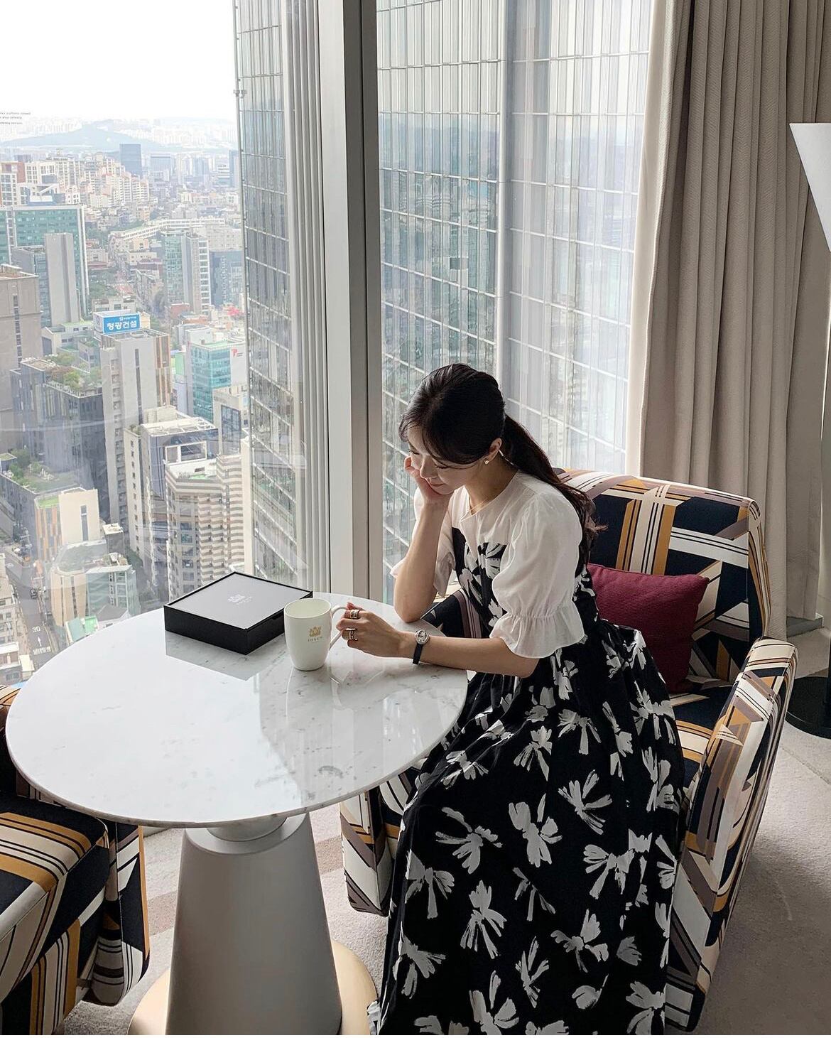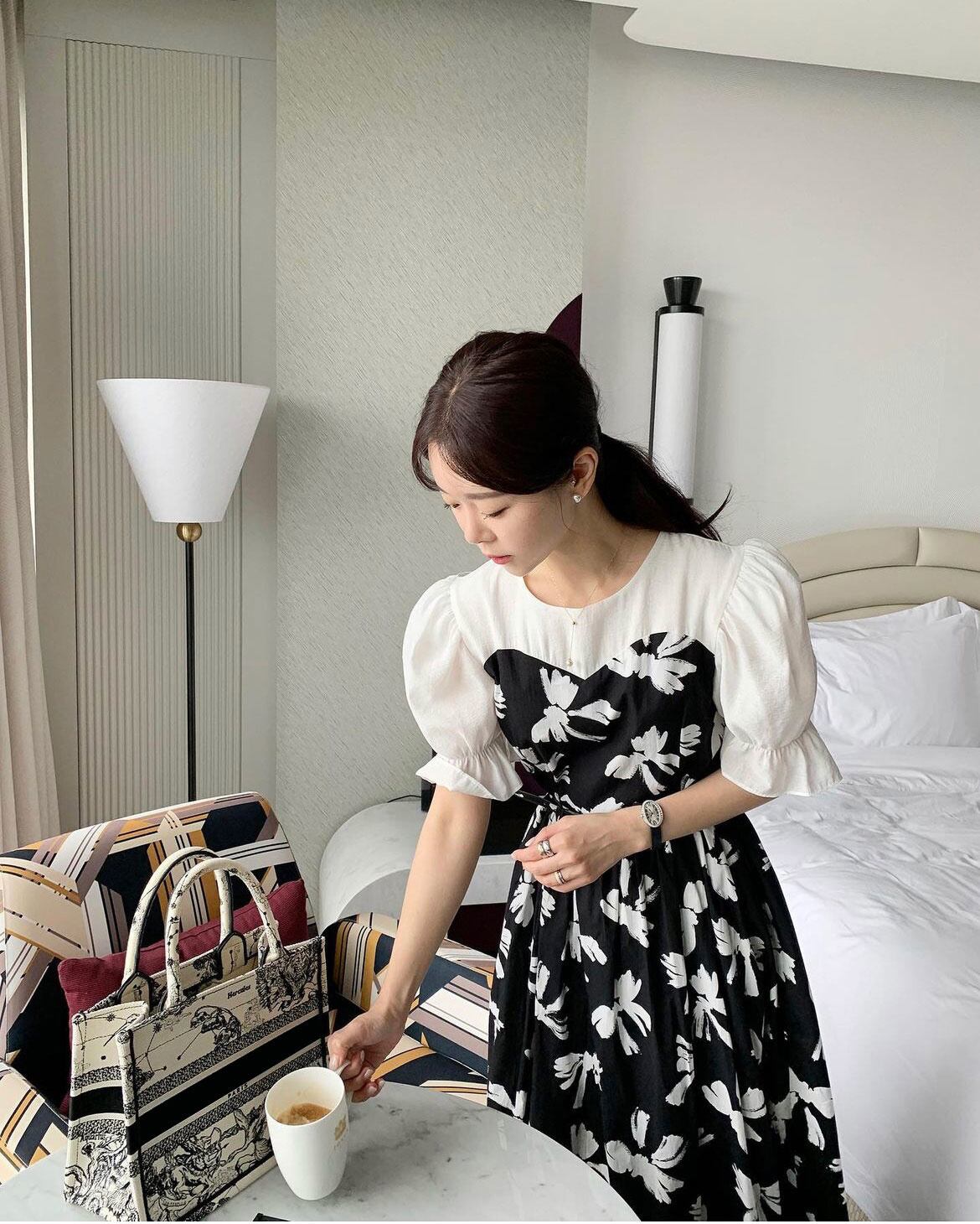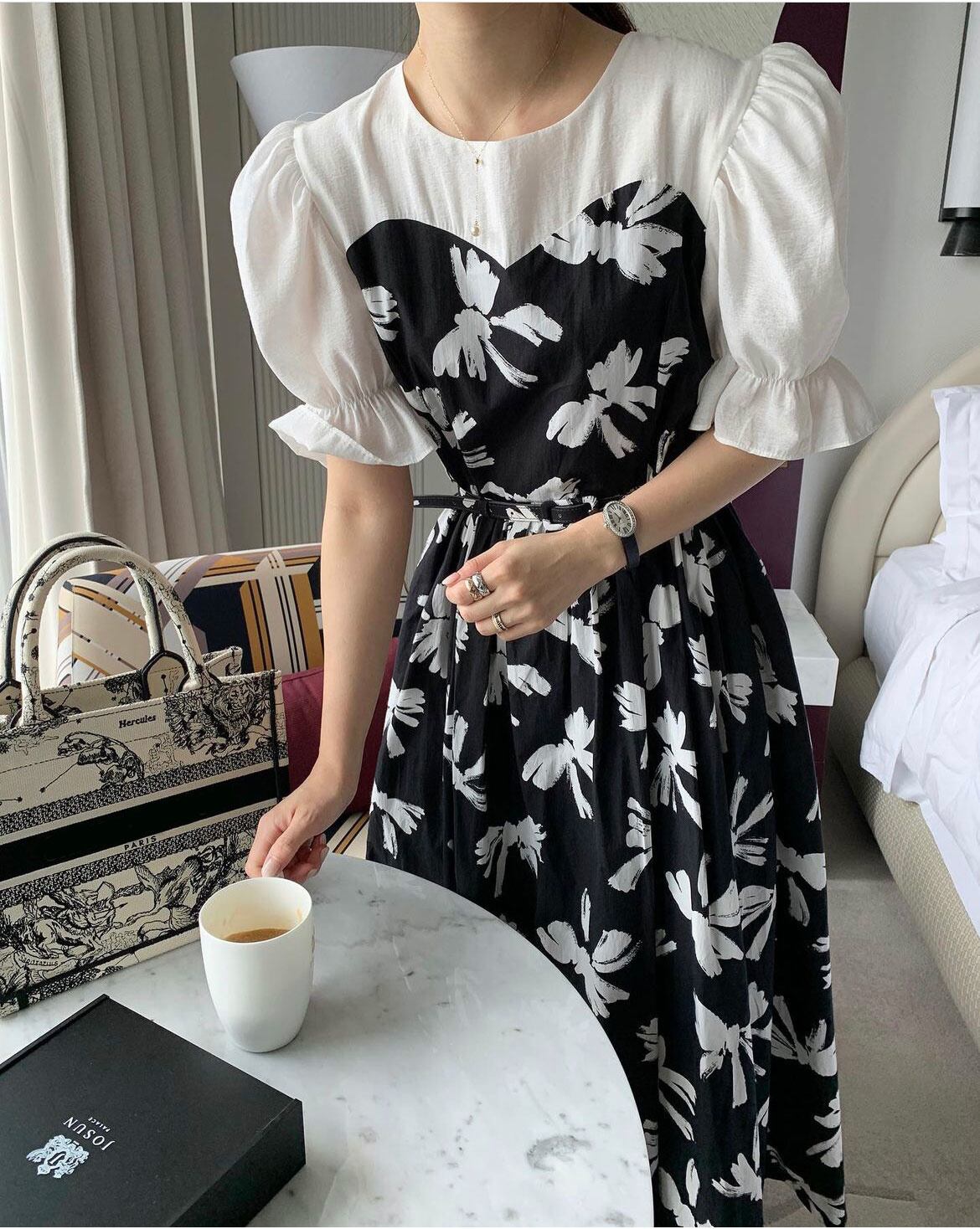 [EWQ] Ro ネック コントラスト ドレススプライシング偽ツーピース レースアップ ウエスト花柄ドレス春夏 Vestido スプリング 春物 サマー 夏物