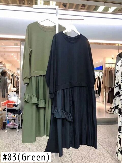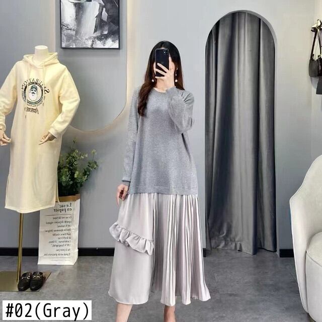 [EWQ] ルーズプリーツフリルスプライスドレス O ネック無地パッチワークマキシドレス春秋 Vestido 16Y6845 スプリング 春物 オータム 秋物 Oネック ソリッドカラー