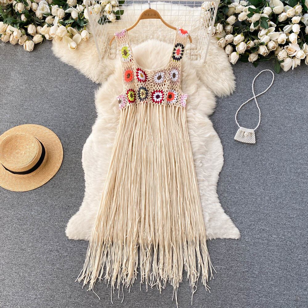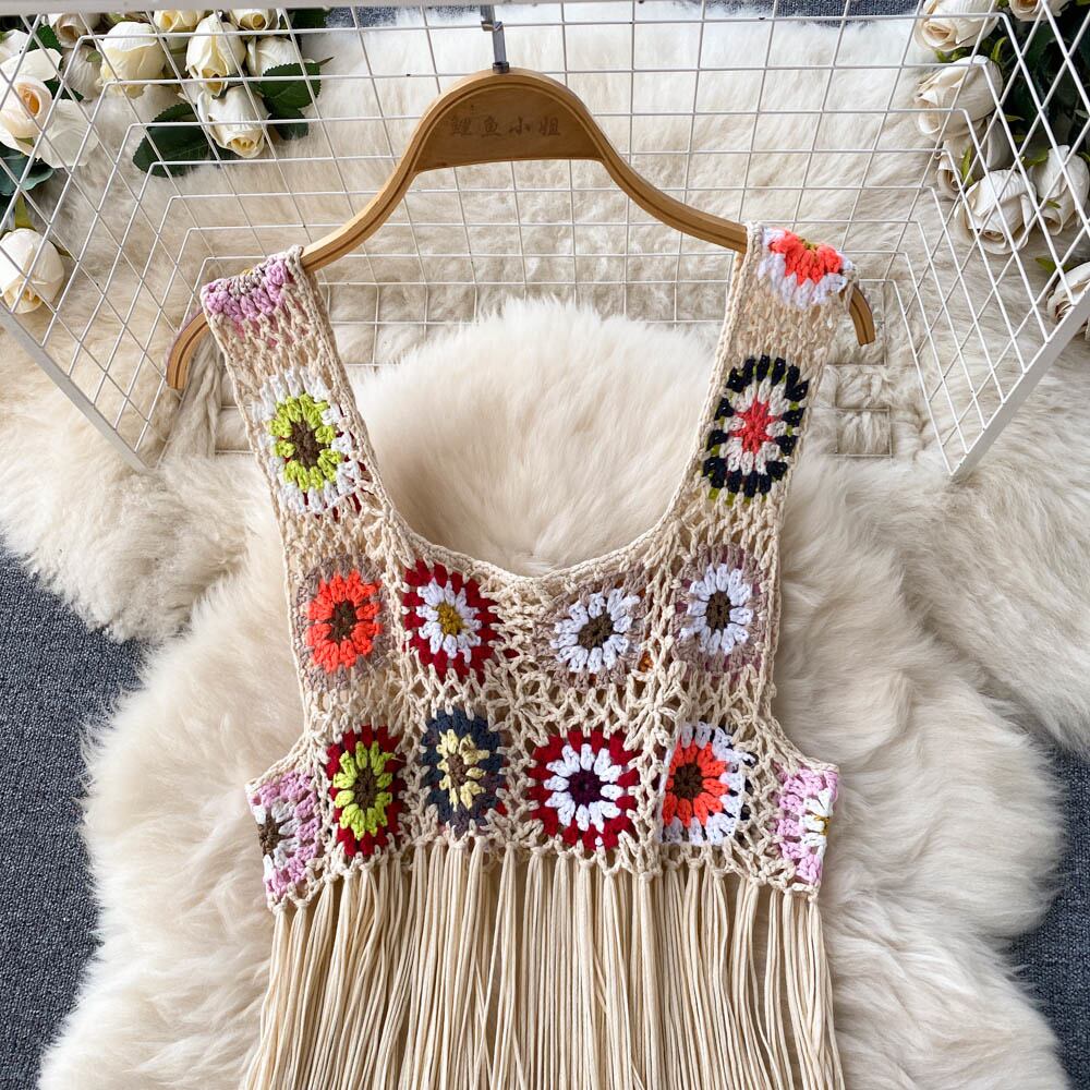[EWQ] ニット花中空電話ドレス ビーチ ホリデー ノースリーブ ニット ドレス春夏 Vestido Y6451 スプリング 春物 サマー 夏物 フラワーデザイン