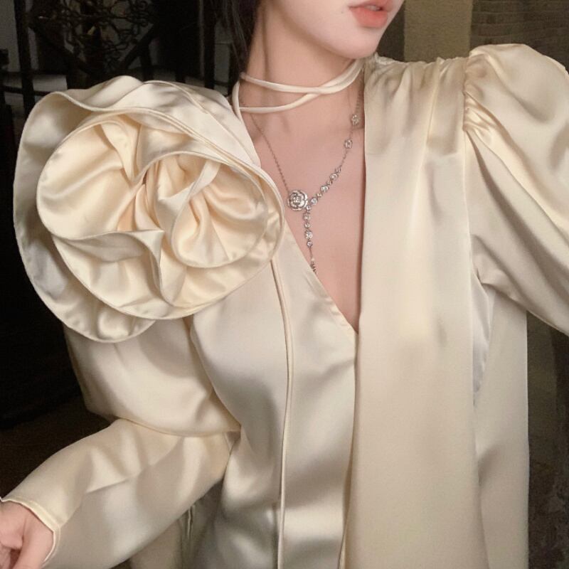 [EWQ] 気質シャツ花秋春 V ネック長袖包帯ルーズブラウストップス ロング スプリング 春物 オータム 秋物 Vネック フラワーデザイン