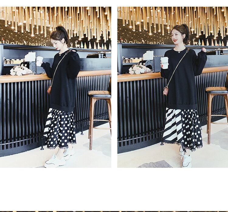 [EWQ] イレギュラー ストライプ ドット コントラストカラー レディース ドレス パッチワーク テルドレス 春 秋 長袖 Rode 6Y7496 ロング スプリング 春物 オータム 秋物