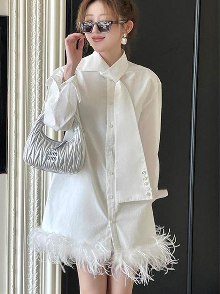 [EWQ] 羽電話スプライシング無地ミニドレスシングルブレストネクタイシャツドレス夏全試合服 59 サマー 夏物 ソリッドカラー