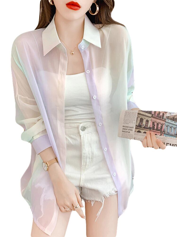 [EWQ] レインボーコントラスト長袖シャツシングルブレストシフォンブラウストップ春秋トップス ロング スプリング 春物 オータム 秋物
