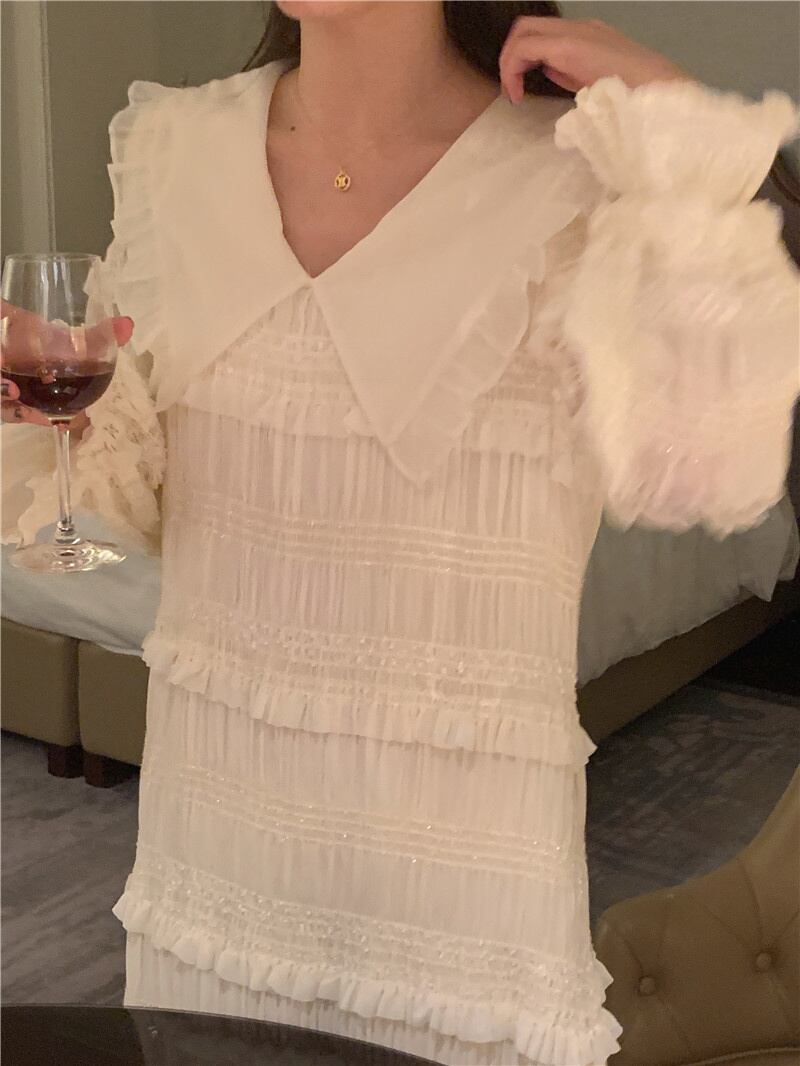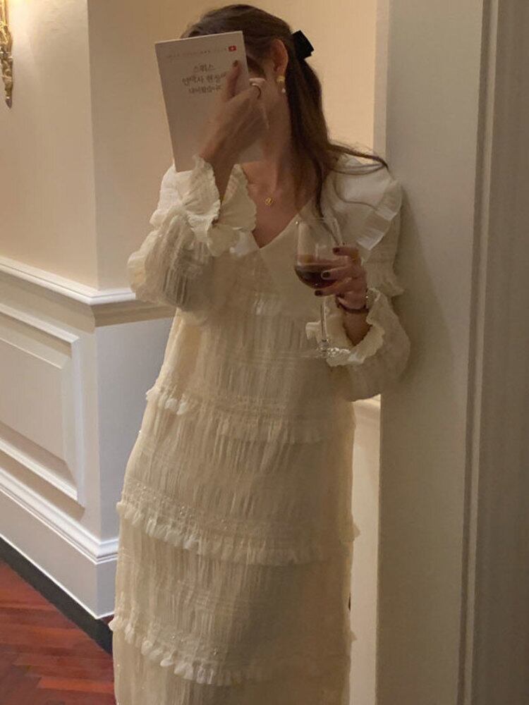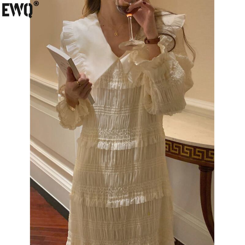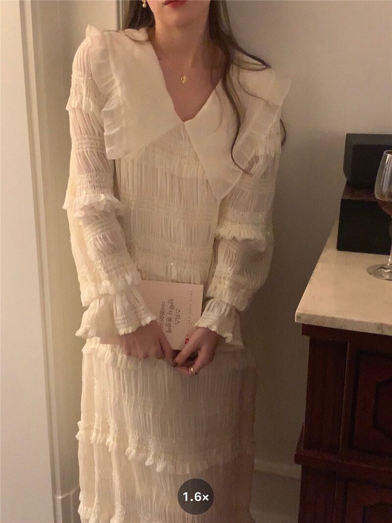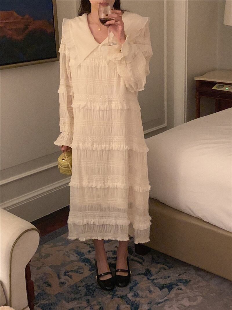 [EWQ] 甘いソフトラペルプリーツドレス無地長袖フリルドレス春秋美しいローブ ロング 大人ガーリー スウィート キュート カジュアル スプリング 春物 オータム 秋物 ソリッドカラー