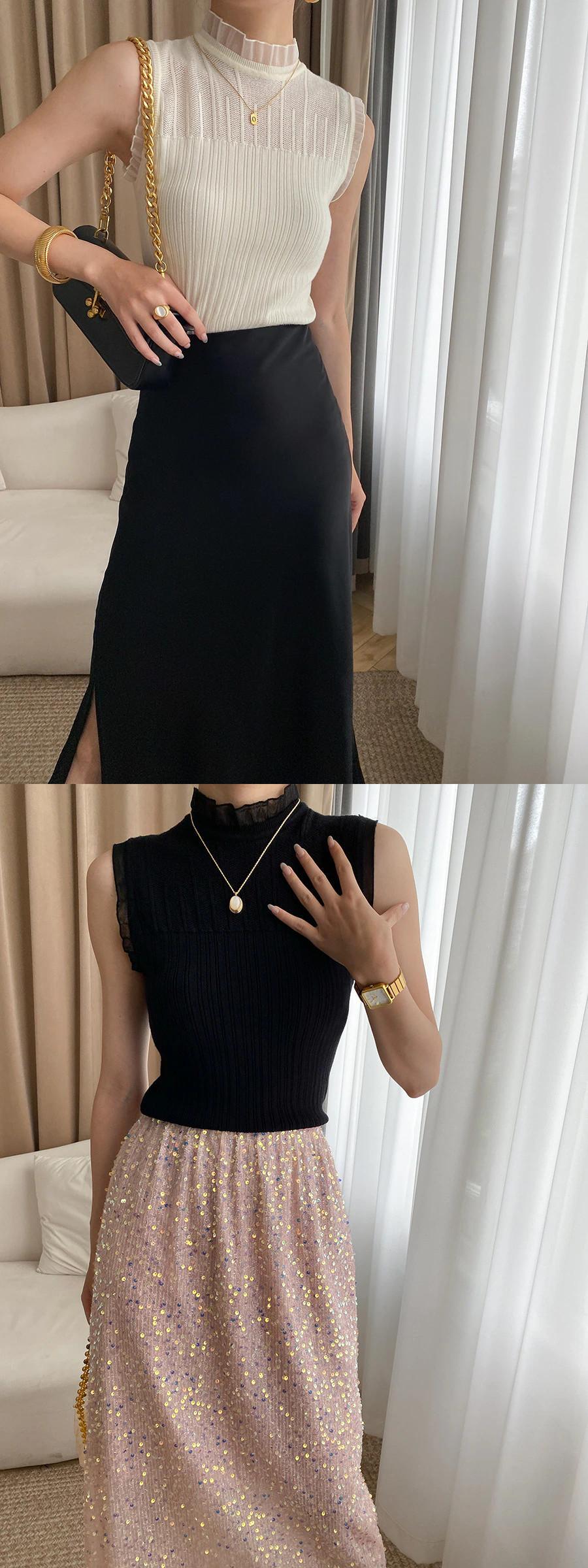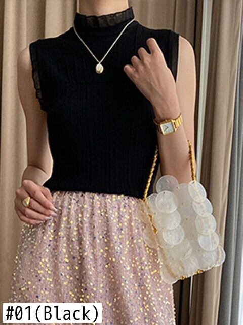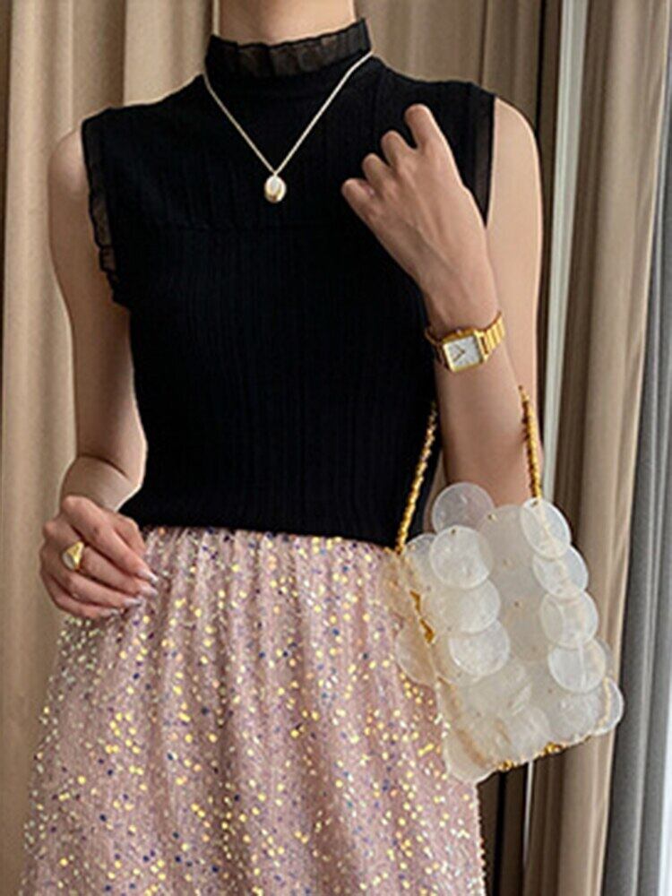 [EWQ] レディース スリム フィット Tシャツ ニット ベスト スタンド ネック フリル スプライシング ノースリーブ タンクトップ サマー タイド ニット トップ 16Y8358 夏物