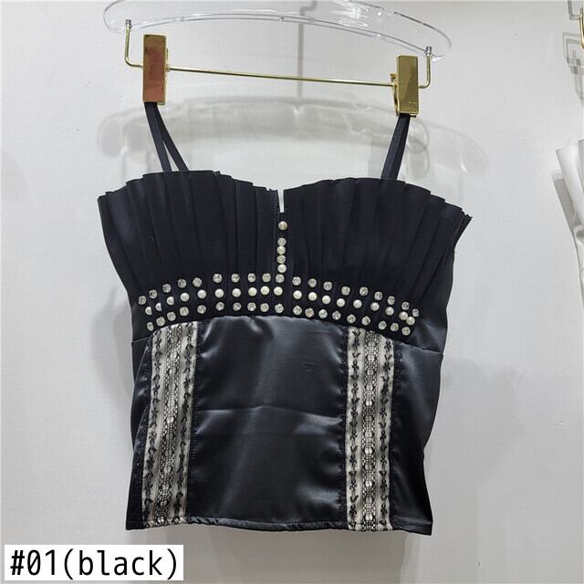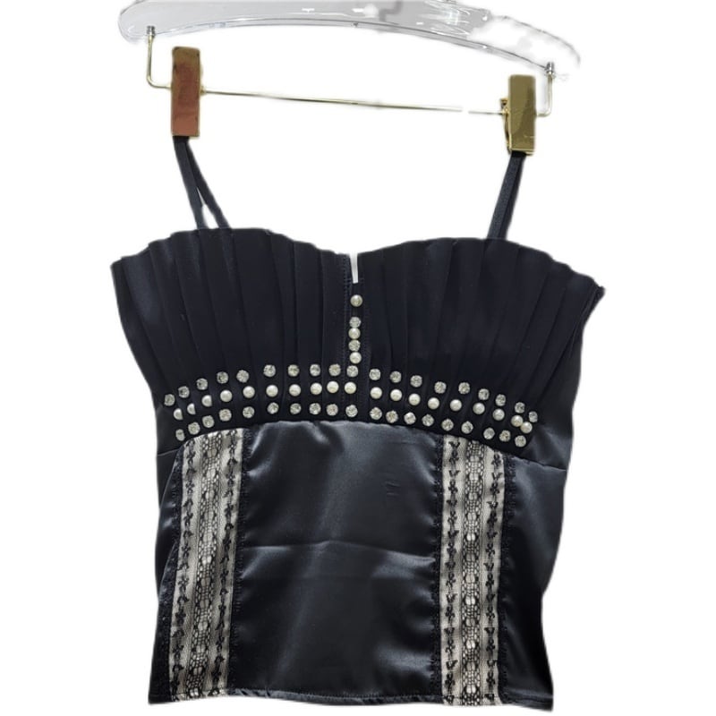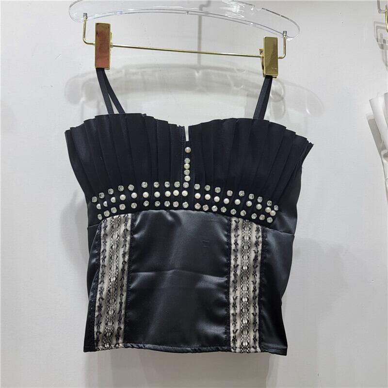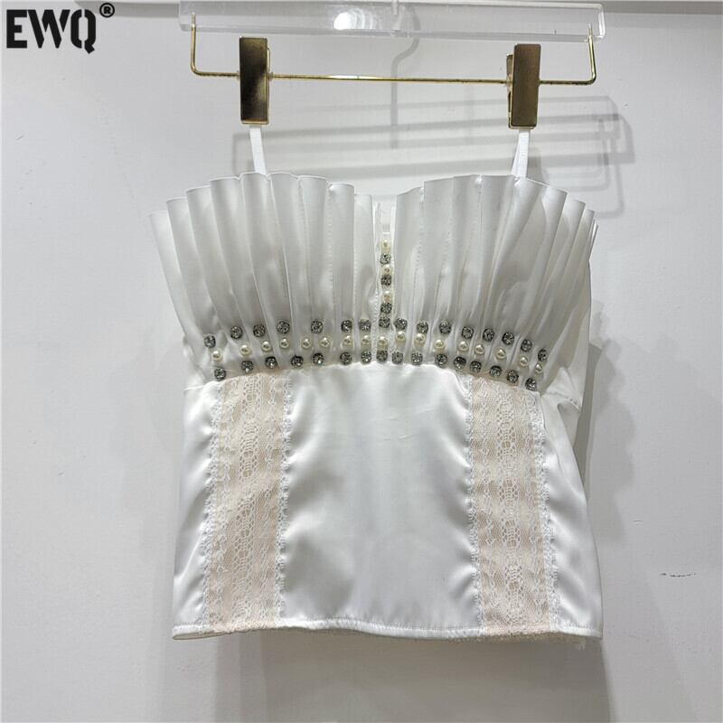 [EWQ] クリスタル プリーツ フリル スプライス タンクトップ ノースリーブ セクシー サマー コントラストカラー キャミソール Y2K トップス Y7705 夏物