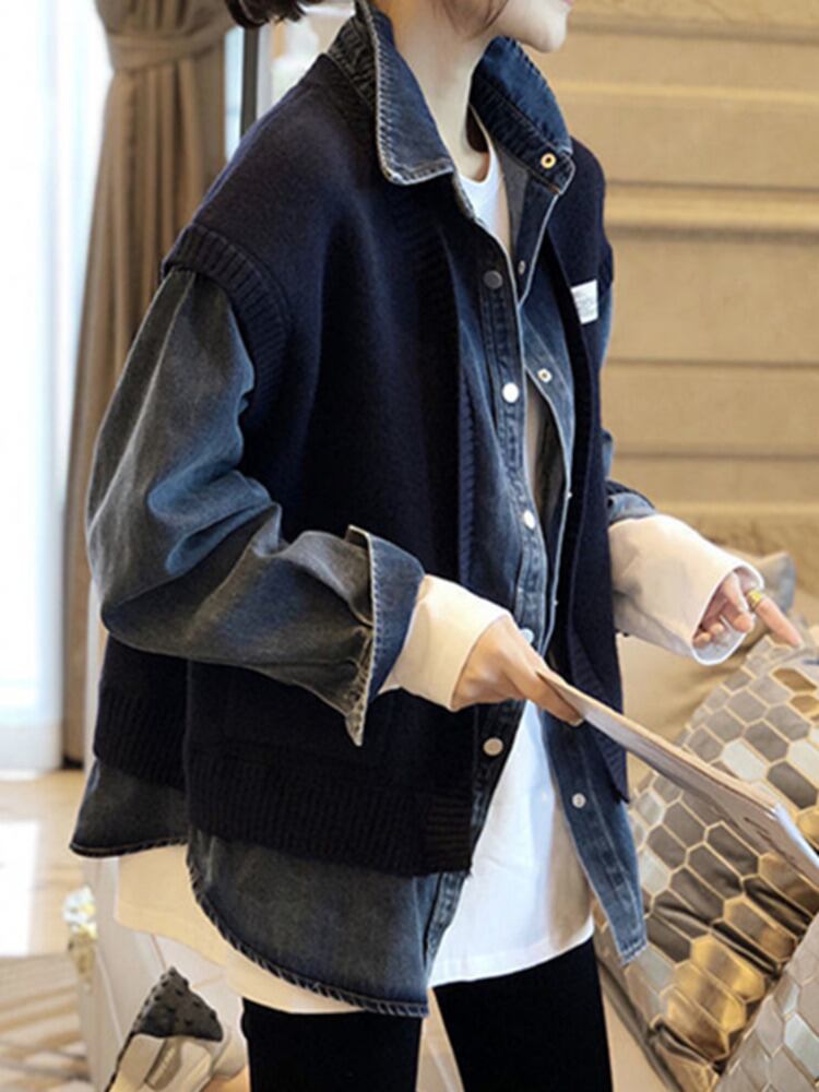 【EWQ】フェイクツーピース ターンダウンカラー ジャケット パッチワーク レディース アウター 秋 ゆったり ニット カーディガン コート オータム 秋物