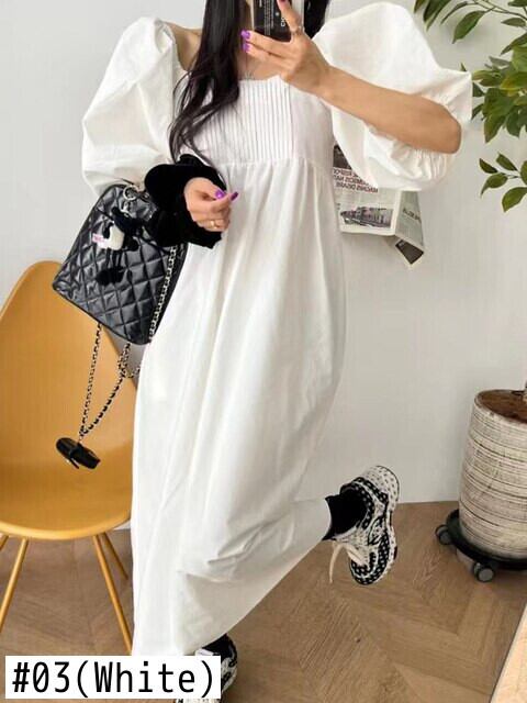[EWQ] スクエアカラー プリーツ ルーズ ドレス 無地 パフ スリーブ マキシ ドレス 夏 426 サマー 夏物 ソリッドカラー スクウェア