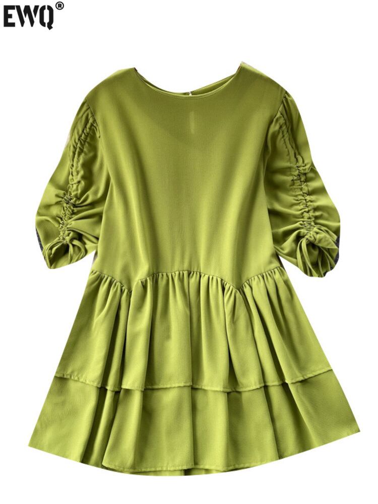 [EWQ] 夏巾着プリーツ ドレス フリル スプライシング無地パフ スリーブ ミニ ドレス Vestido 16Y7245 サマー 夏物 ソリッドカラー