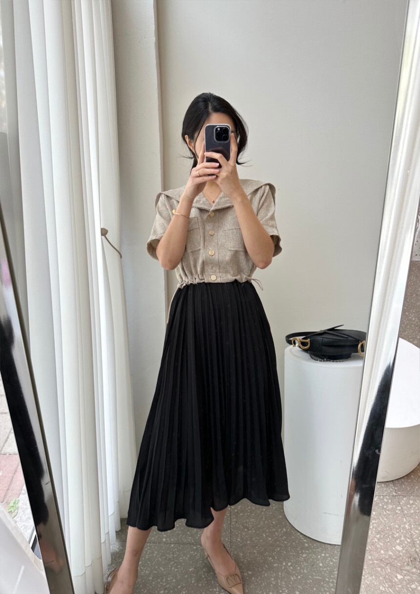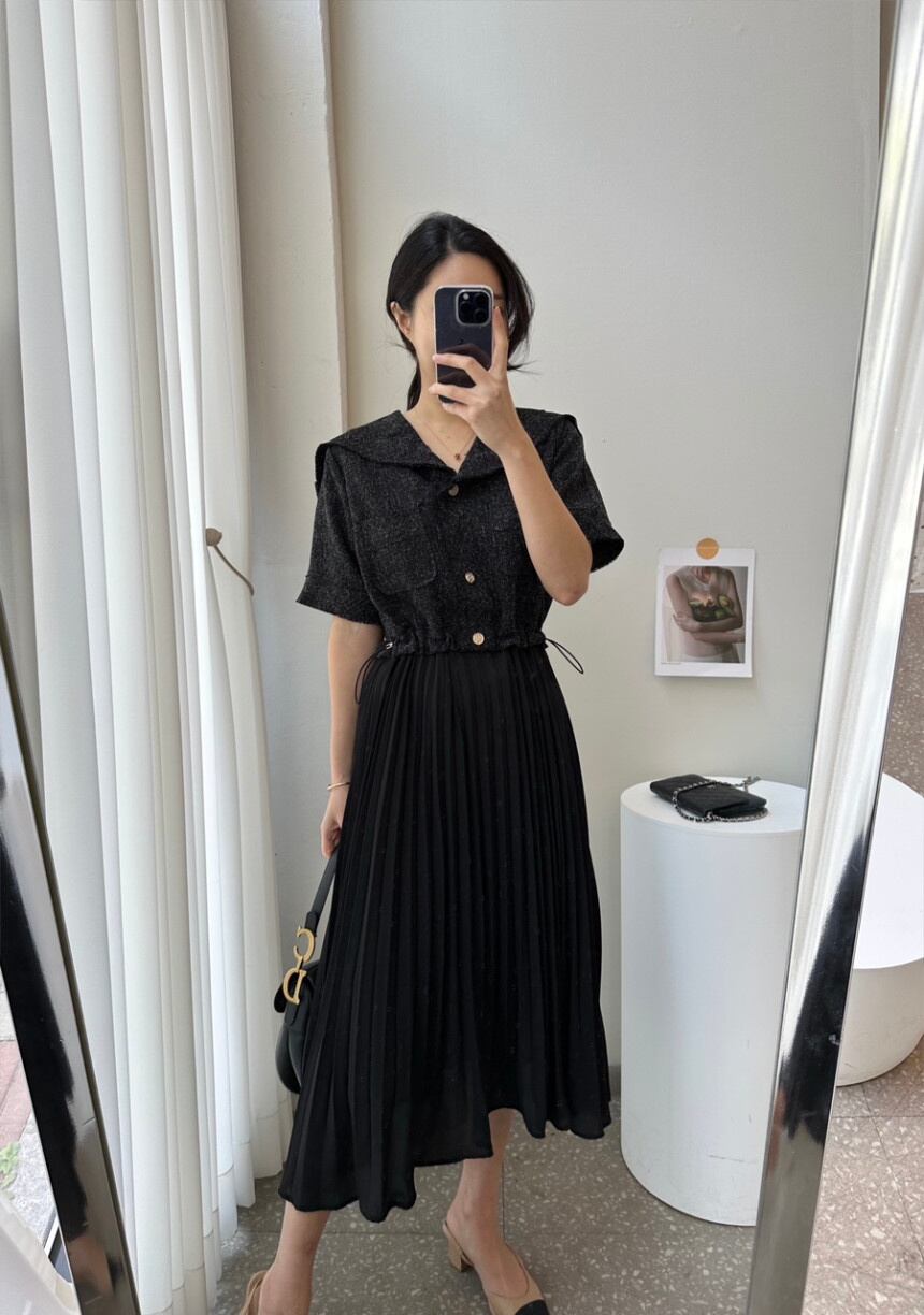 [EWQ] フェイクツーピース半袖プリーツドレスレディース巾着シックボタンパッチワークドレス夏潮Vestido ショート ハーフスリーブ サマー 夏物