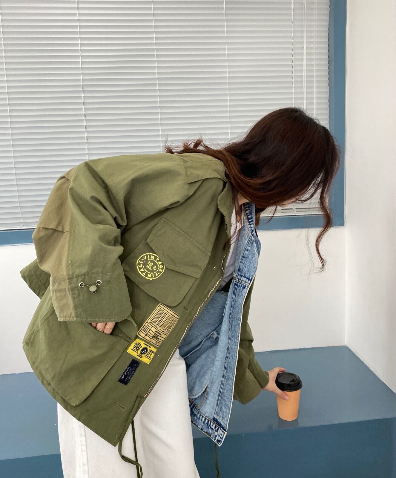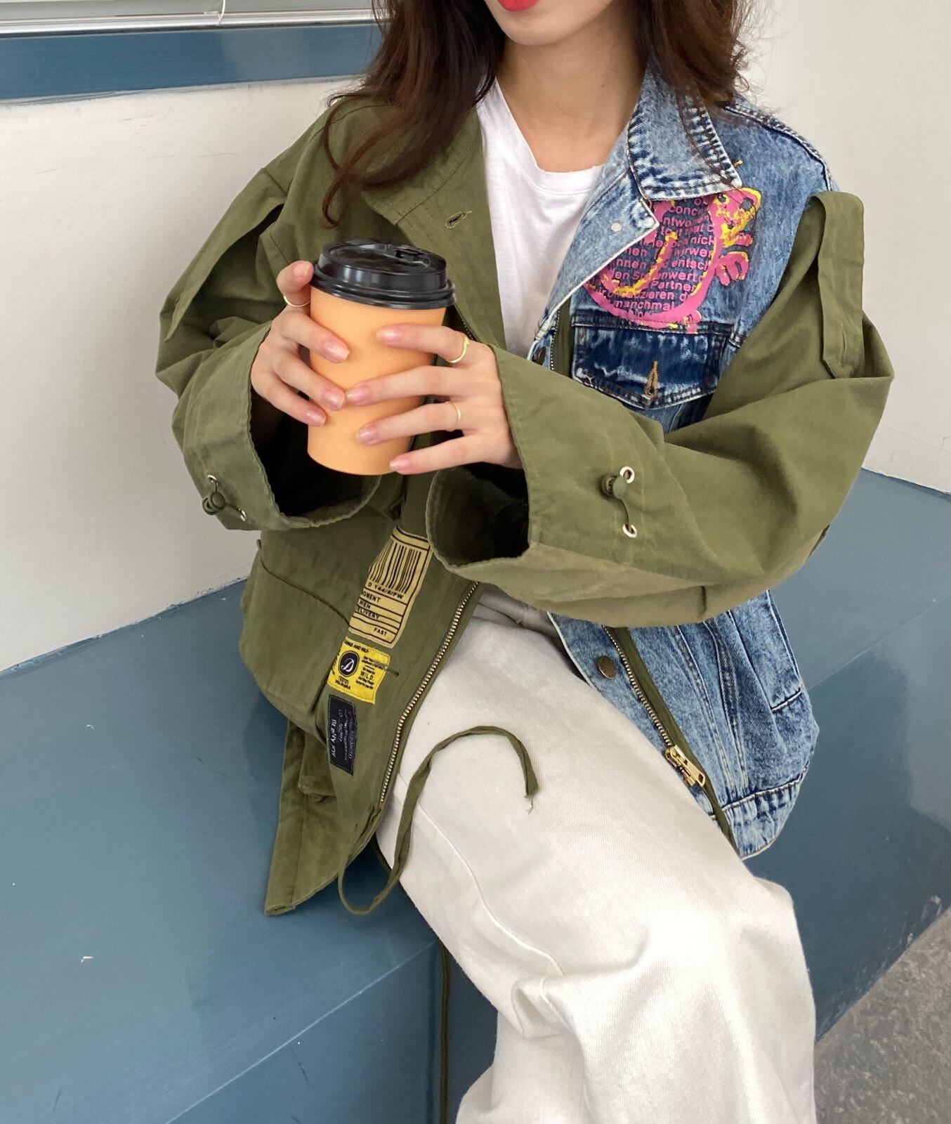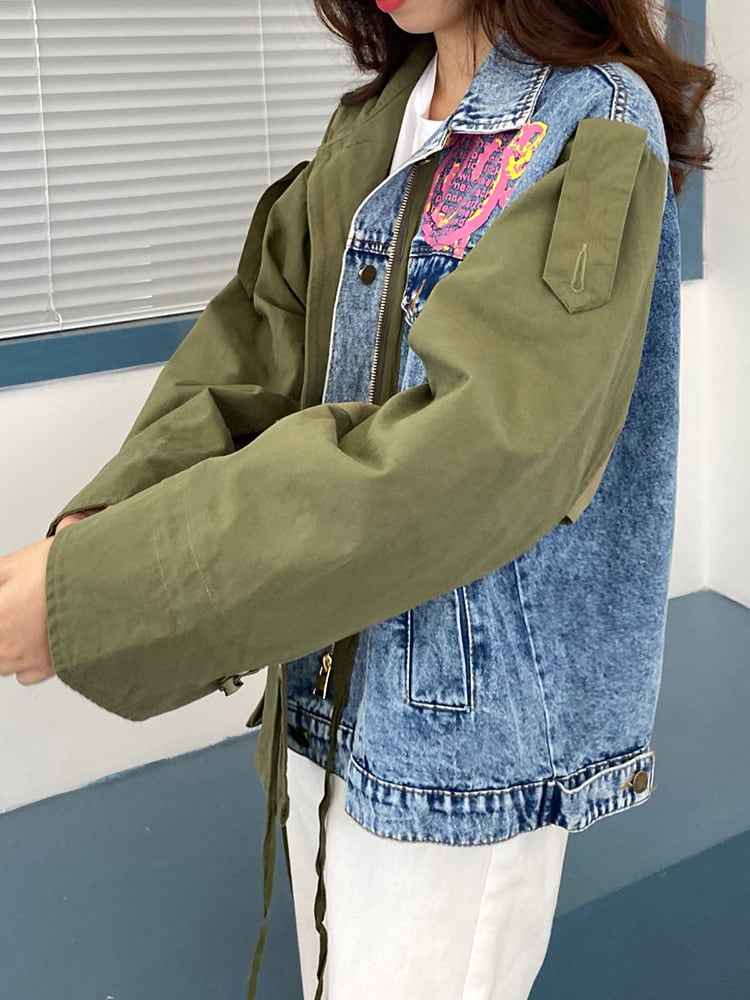 【EWQ】トレンド パッチワーク コントラストカラー デニム ジャケット 長袖 ゆったり オーバーコート ビッグサイズ コート 春物 ロング スプリング