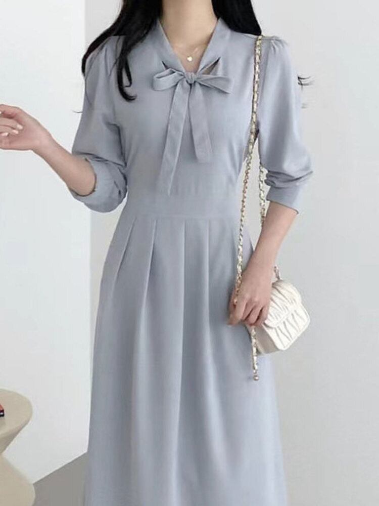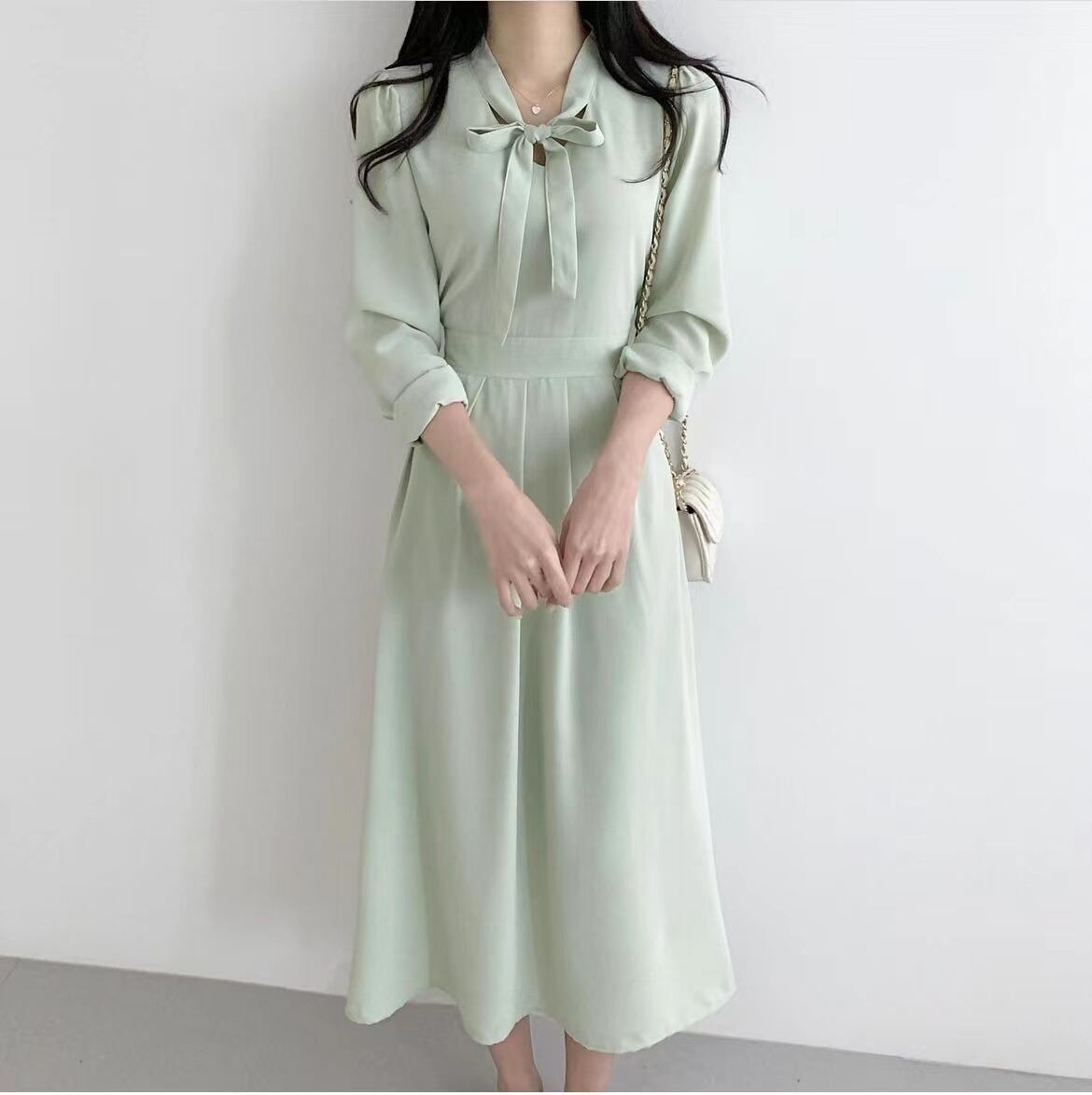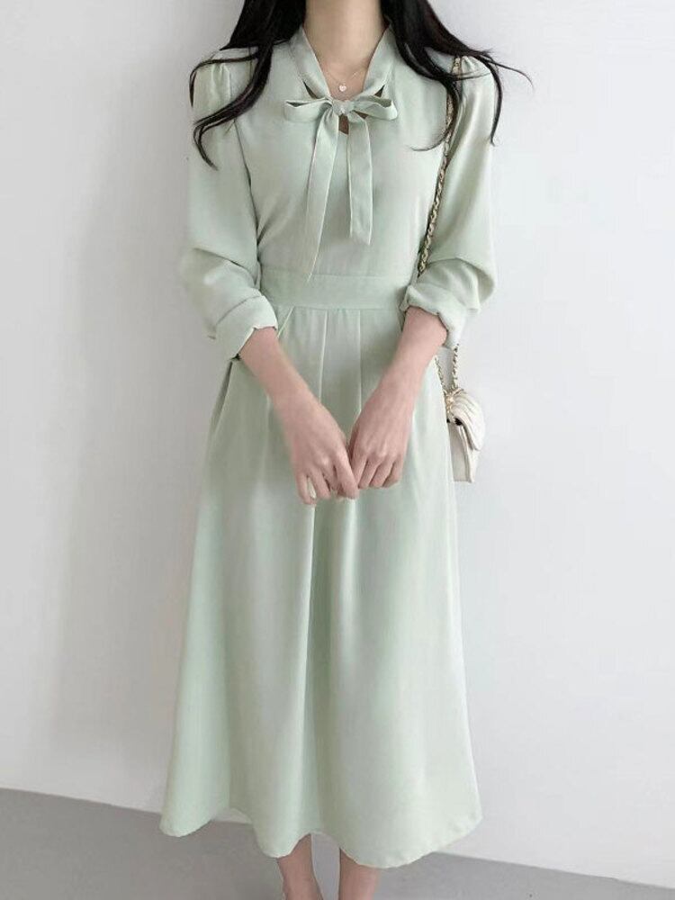 [EWQ] ソフト レースアップ O ネック ドレス長袖無地プリーツ ウエスト ドレス春秋ライト グリーン Vestido ロング スプリング 春物 オータム 秋物 Oネック ソリッドカラー