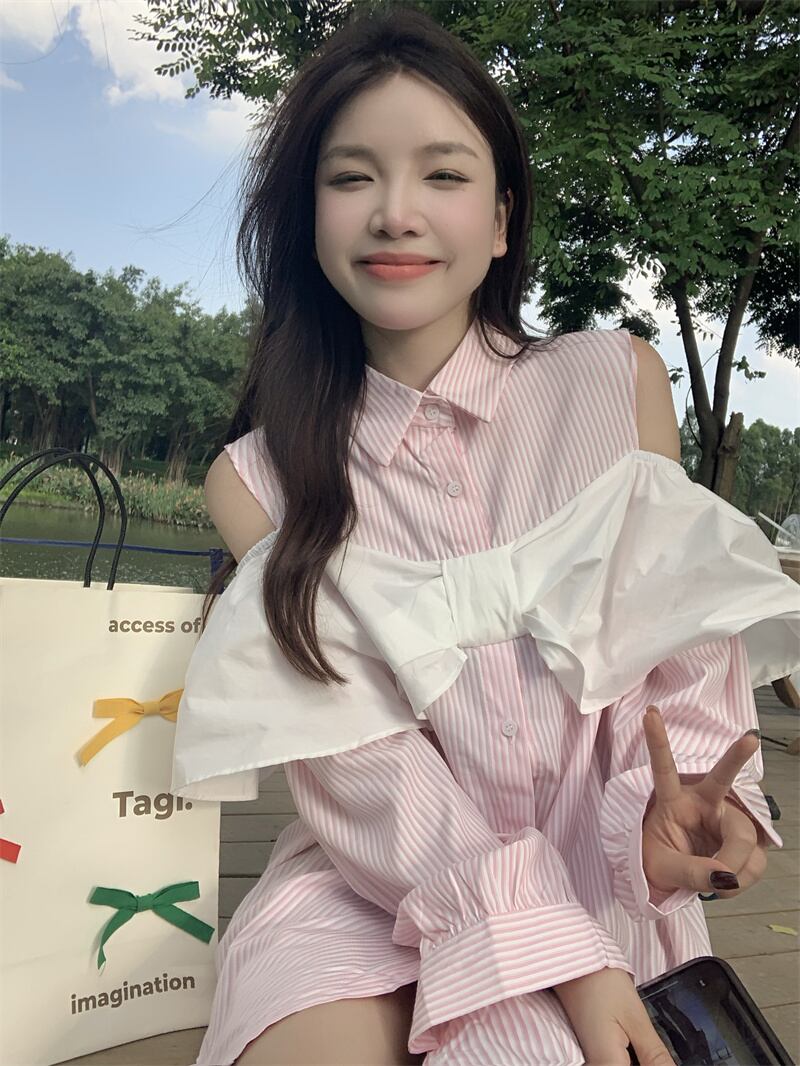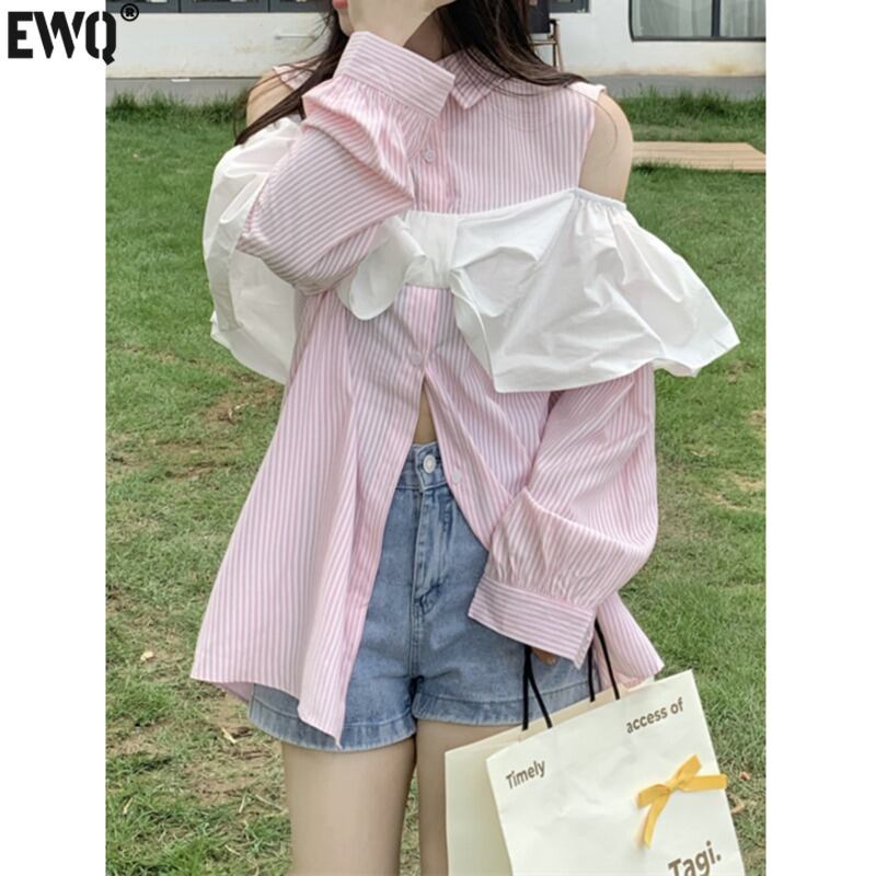 [EWQ] オフショルダーパッチワークシャツスウィートパッチワークブラウストップス春秋ピンクストライプシャツ 6585 大人ガーリー キュート カジュアル スプリング 春物 オータム 秋物