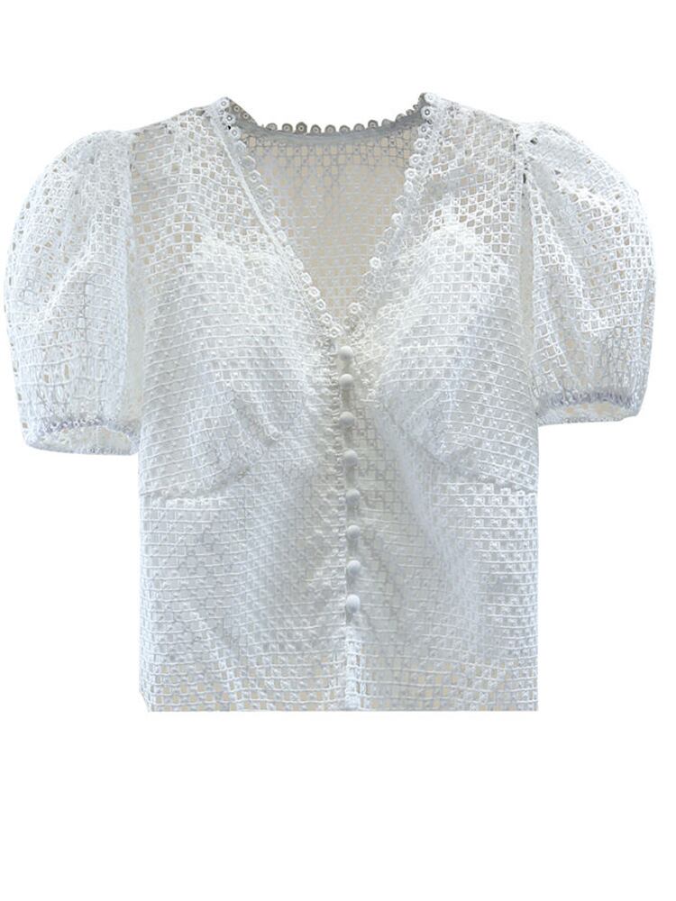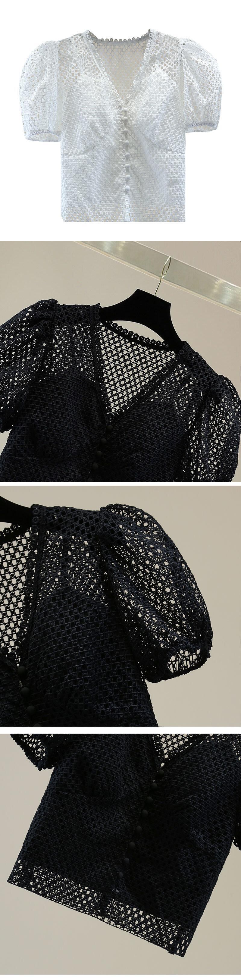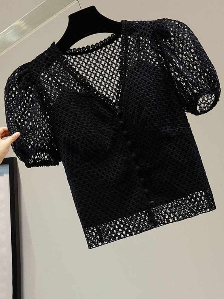 [EWQ] スウィート中空アウトメッシュ Tシャツパフスリーブ V ネックレディ Tシャツトップス夏黒レースラップ Tシャツ ブラック 大人ガーリー キュート カジュアル サマー 夏物 Vネック