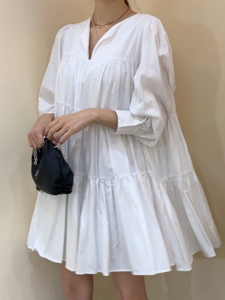 【EWQ】Vネック ステッチゆったり 長袖 白ワンピース 春 シンプル ゆったり カーキ ミニ ベスト ロング ホワイト スプリング 春物