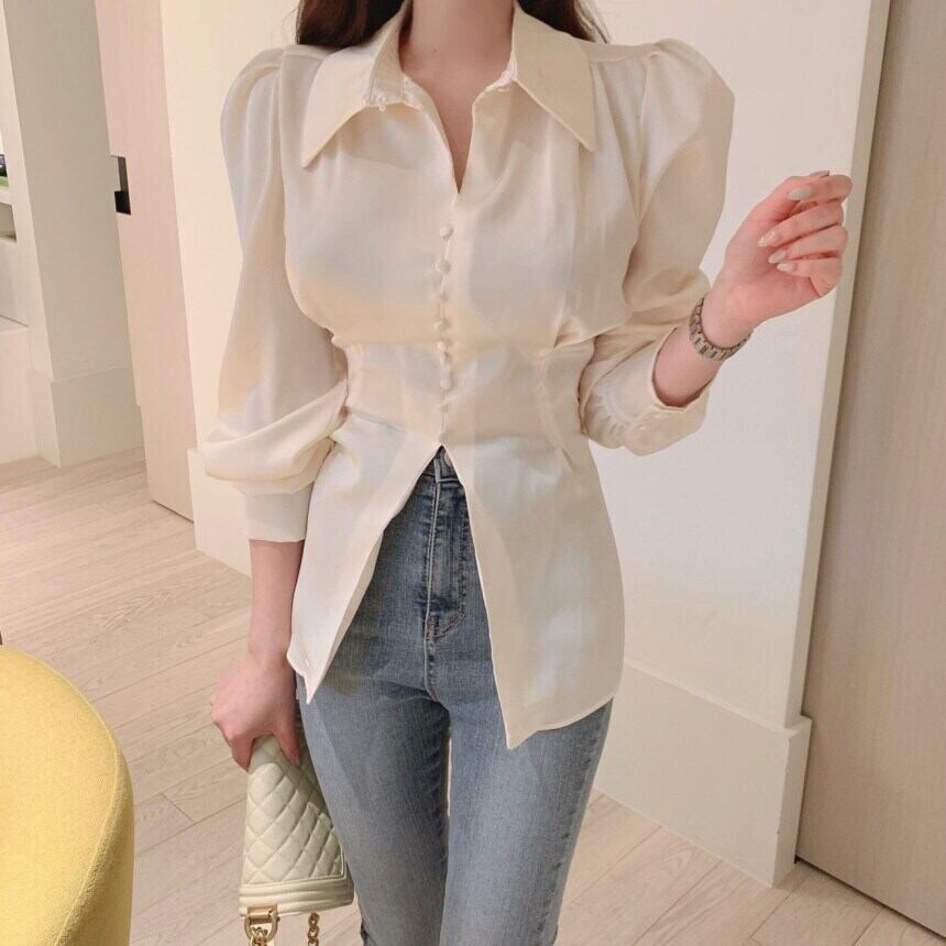 [EWQ] シングルブレストスプリットシャツシックパフスリーブトップ春秋潮セクシーブラウス Y6317 スプリング 春物 オータム 秋物