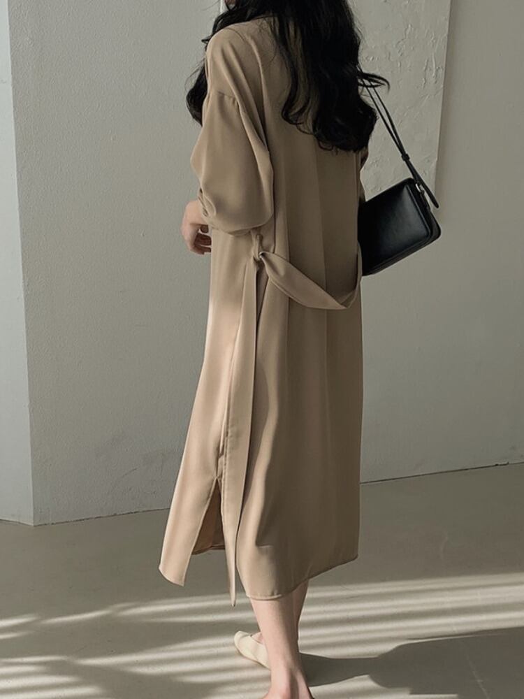 [EWQ] レースアップウエストシャツドレス無地長袖マキシドレス春秋トレンド Vestido ロング スプリング 春物 オータム 秋物 ソリッドカラー