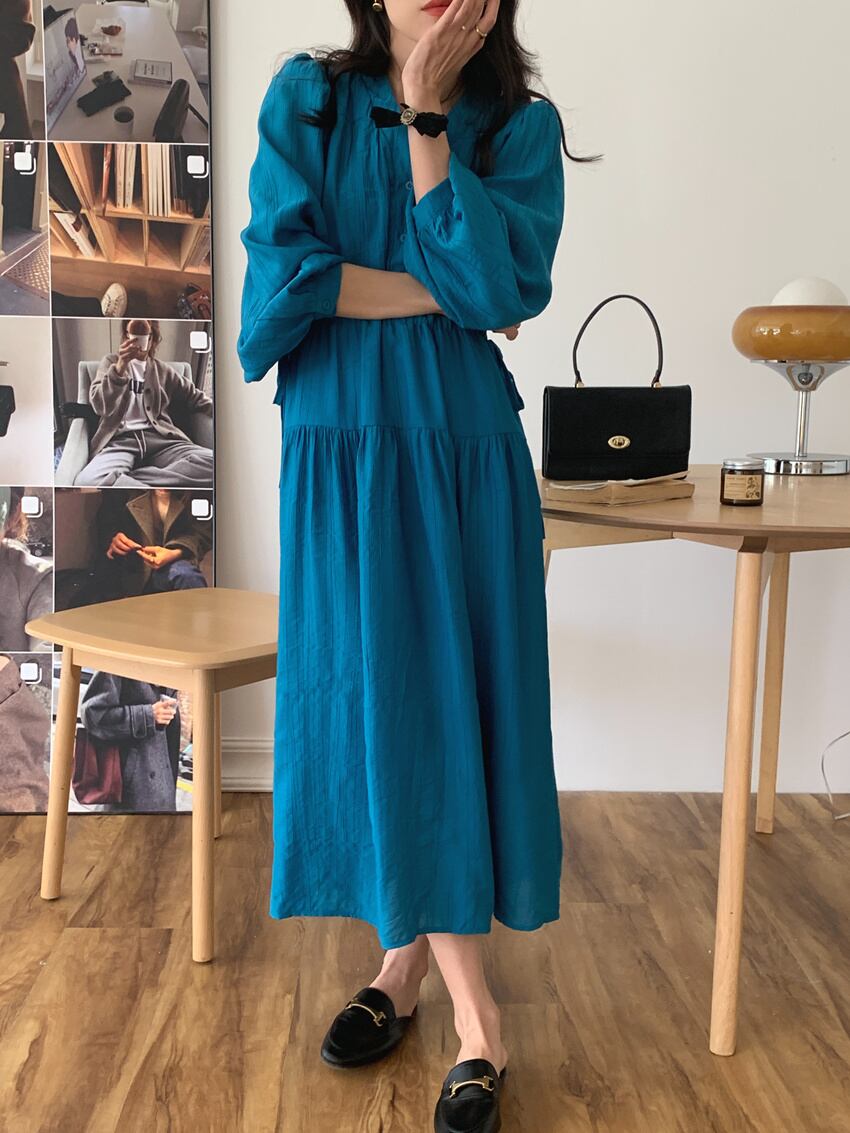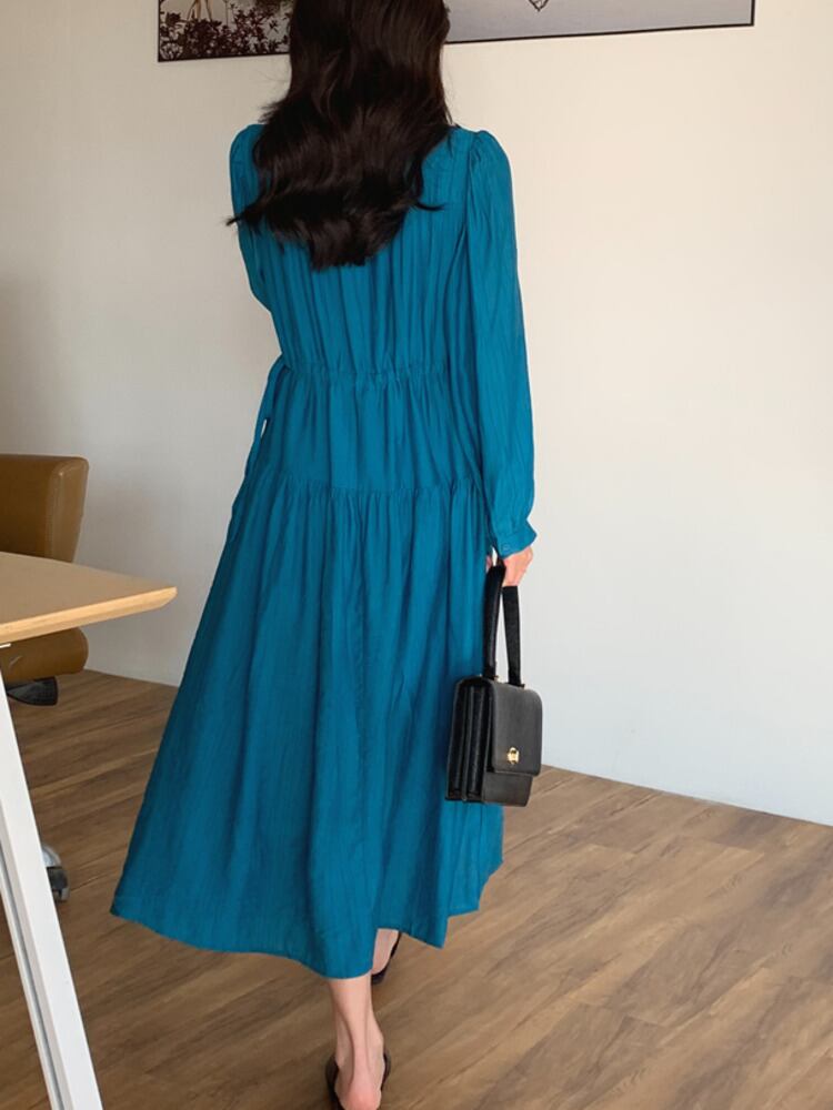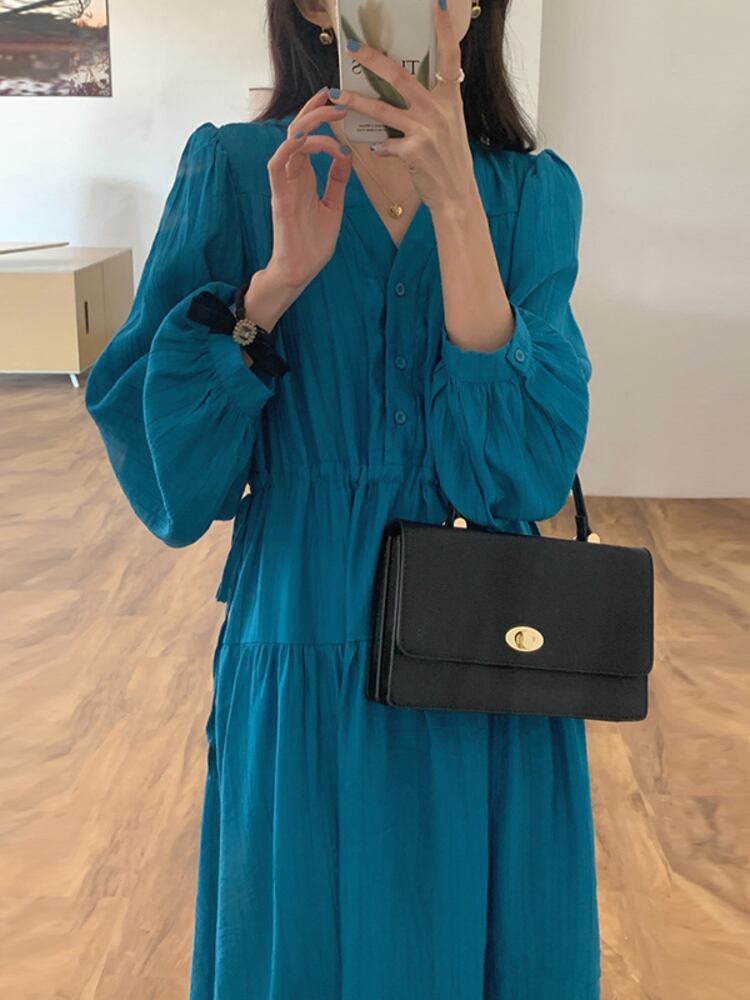 [EWQ] V ネック巾着レース アップ ドレス無地パフ スリーブ プリーツ ドレス春秋 Vestido 7117 スプリング 春物 オータム 秋物 Vネック レースアップ ソリッドカラー