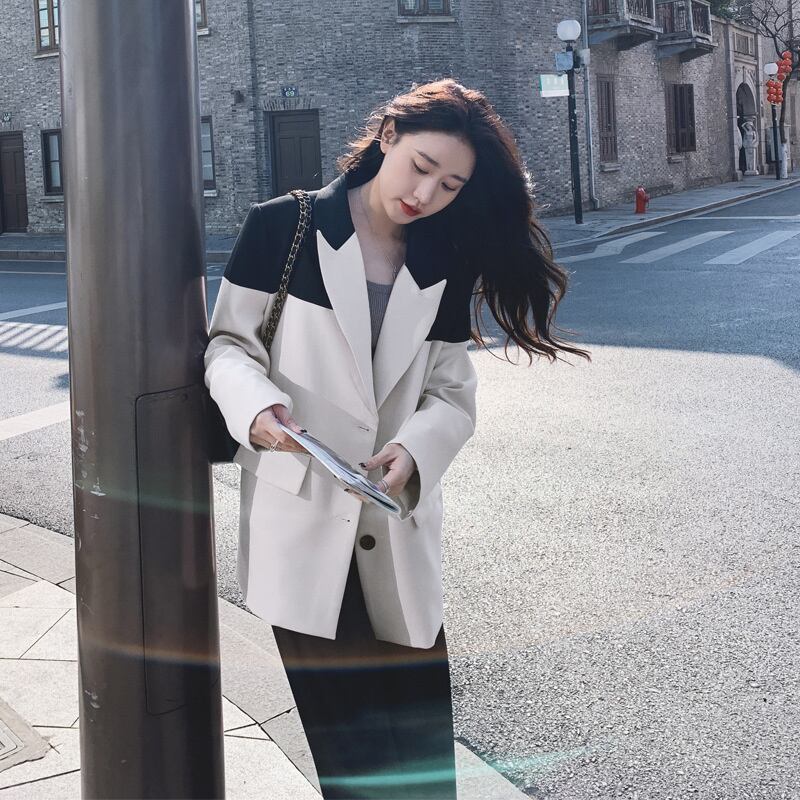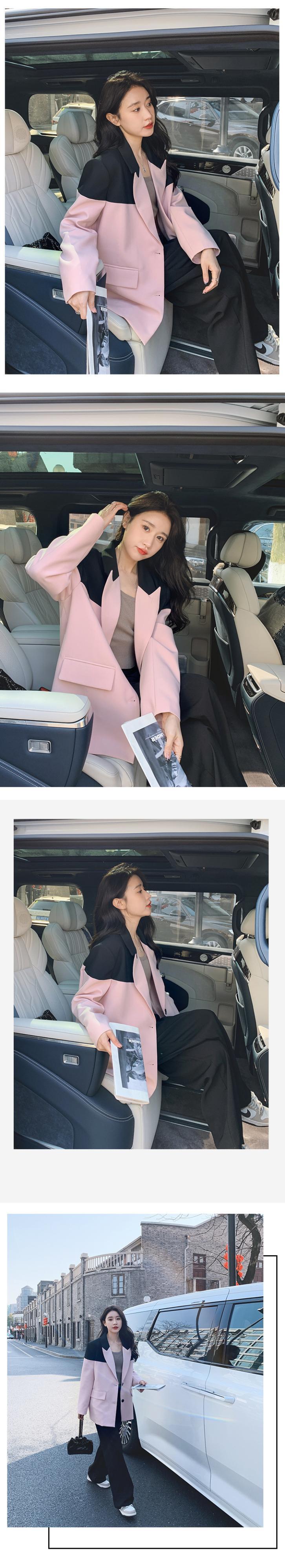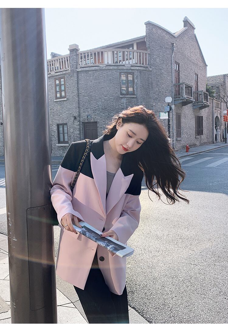 【EWQ】シングルブレスト OL 長袖 配色 コントラスト レディース 上品 ピンク スーツ 春 秋 ロング スプリング 春物 オータム 秋物 会社 学校 通勤や通学にも