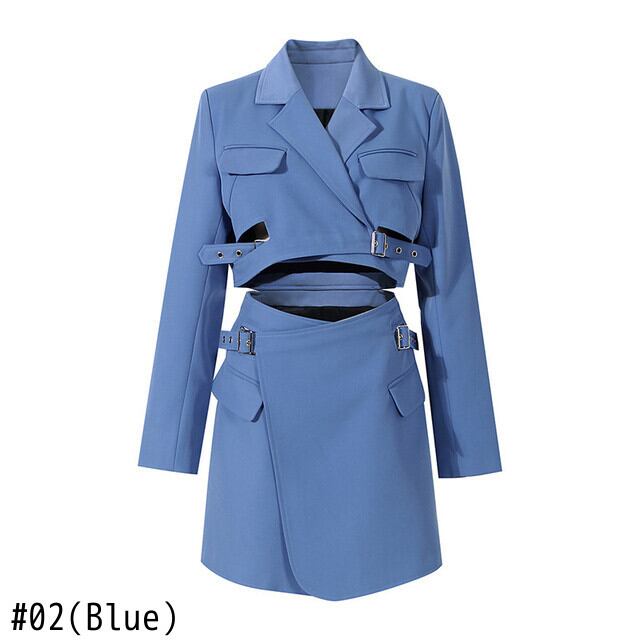 【EWQ】ツーピースセット レディース ノッチ付き 長袖 イレギュラーブレザー ウエストスカート レディースセット 秋 16E4832 ロング オータム 秋物