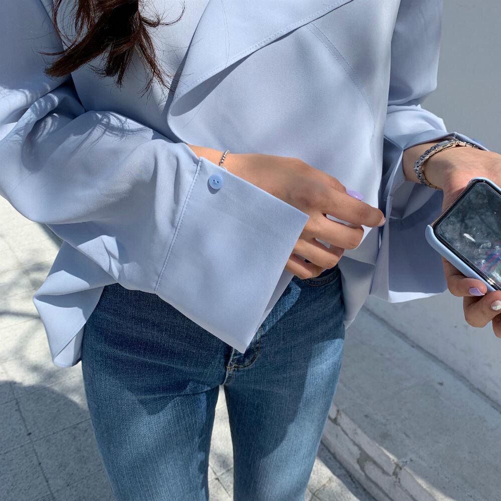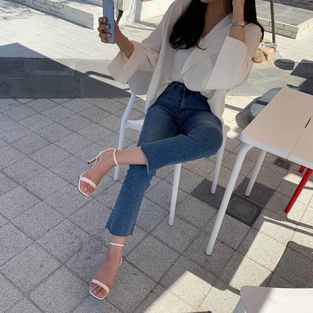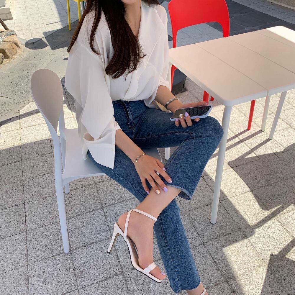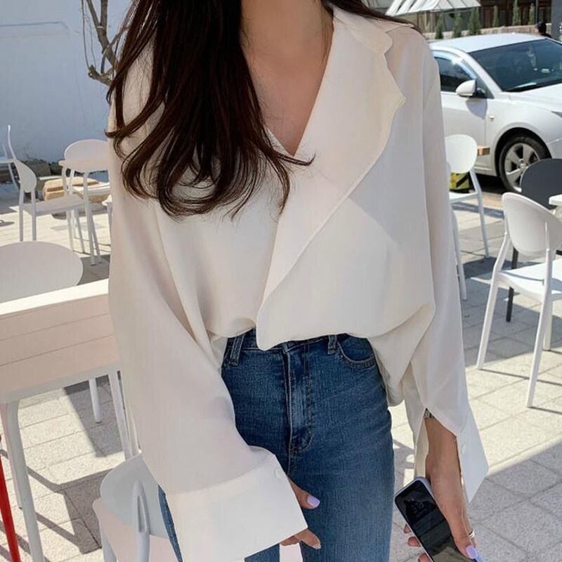 [EWQ] シックイン スタイル ブラウス無地 V ネック非対称春太陽プルーフ レトロ優しいオールマッチ トップス スプリング 春物 Vネック ソリッドカラー