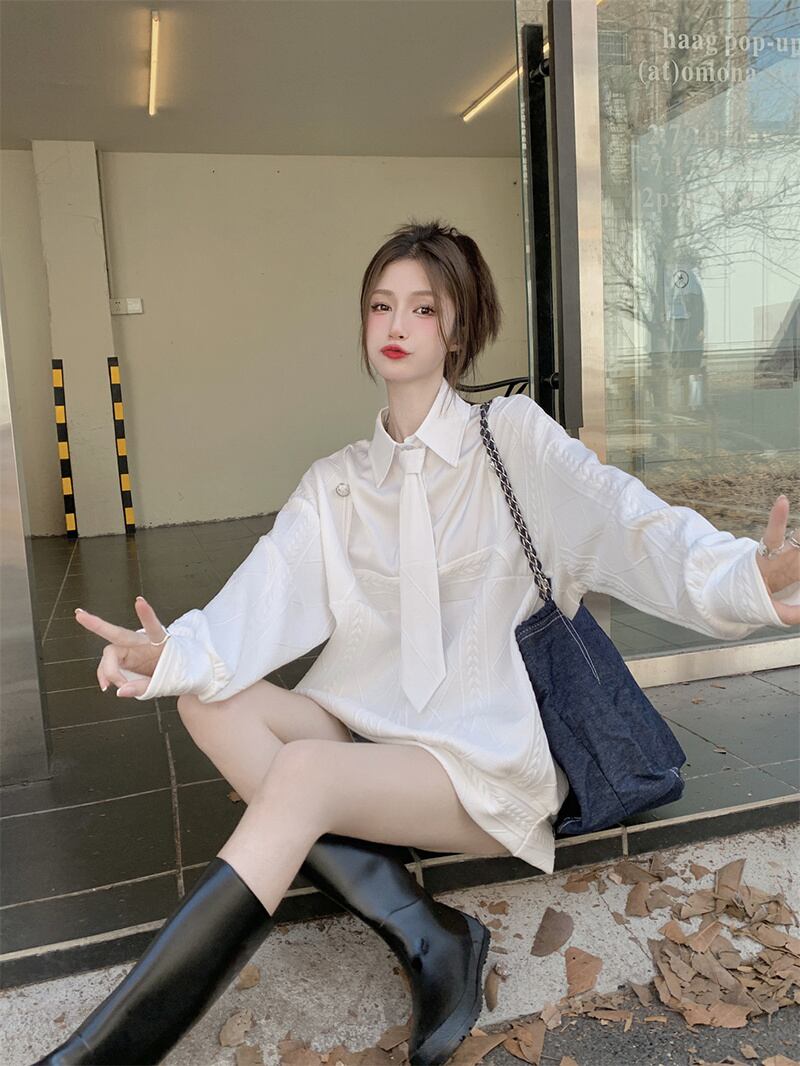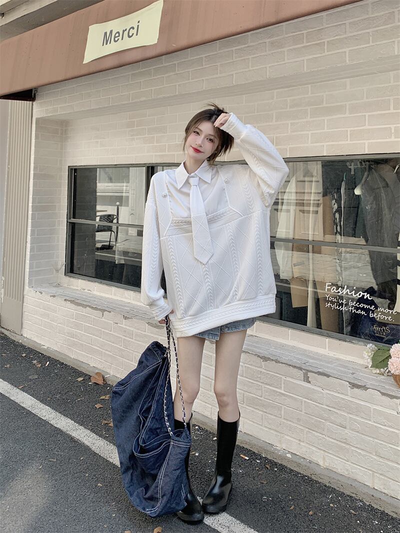 【EWQ】 ターンダウンカラーセーター パッチワーク スウェット レディース 春 シック ネクタイ 長袖 パーカー 16Y5764 ロング スプリング 春物