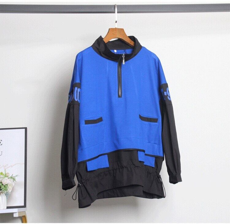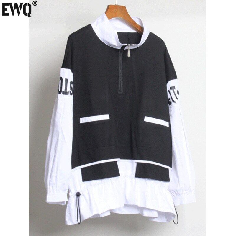 [EWQ] カラー コントラスト プリント スウェットシャツ ジッパー O ネック巾着プルオーバー春秋潮ストリート レター トップス スプリング 春物 オータム 秋物 Oネック