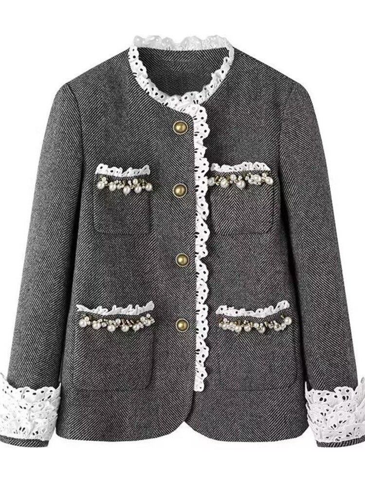 [EWQ] 冬レース フリル スプライス グレー コート オフィス レディ長袖ウォーム ジャケット ロング ウィンター 冬物 会社 学校 通勤や通学にも