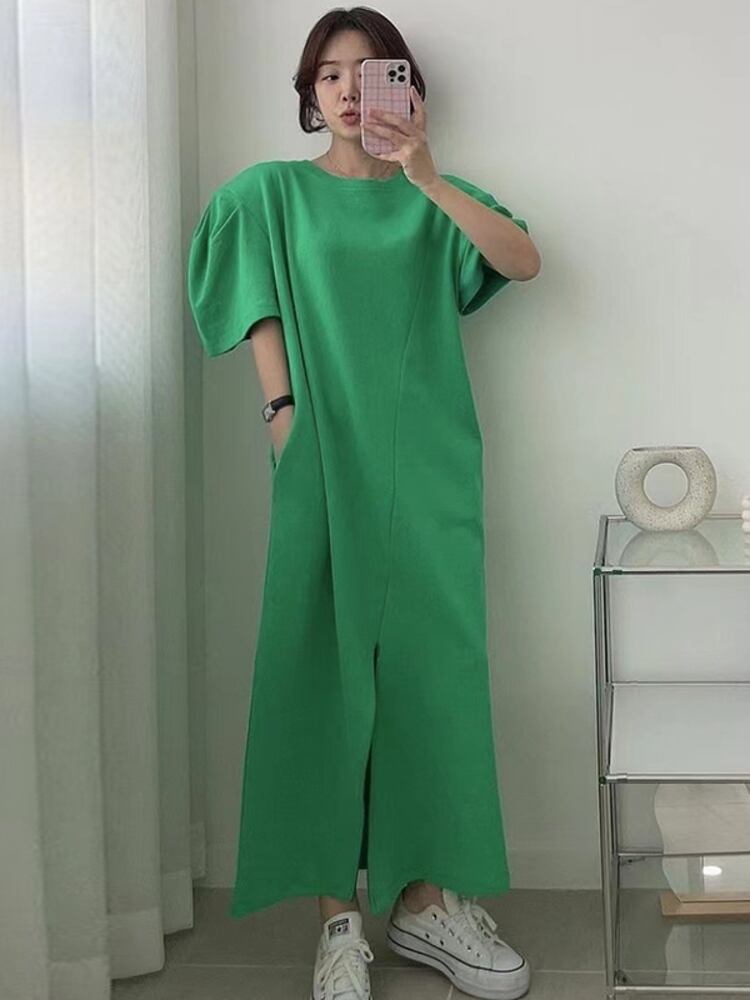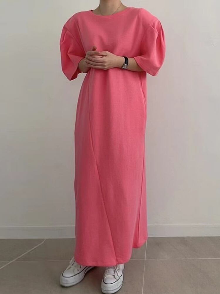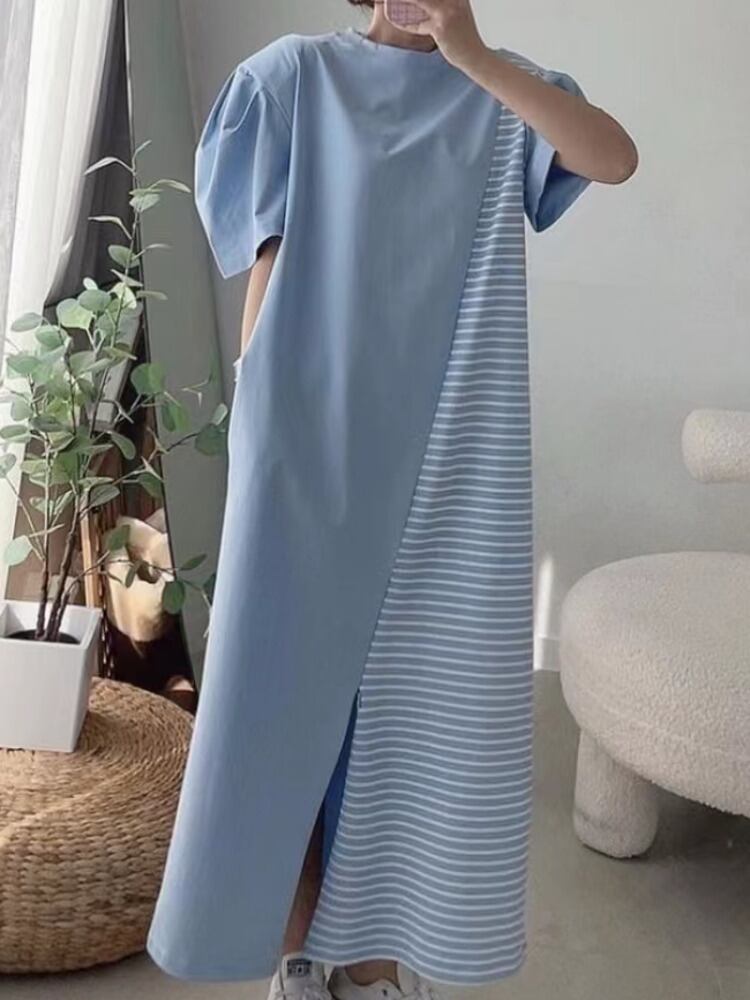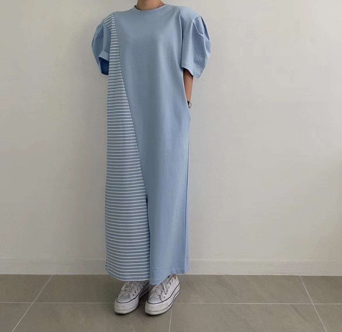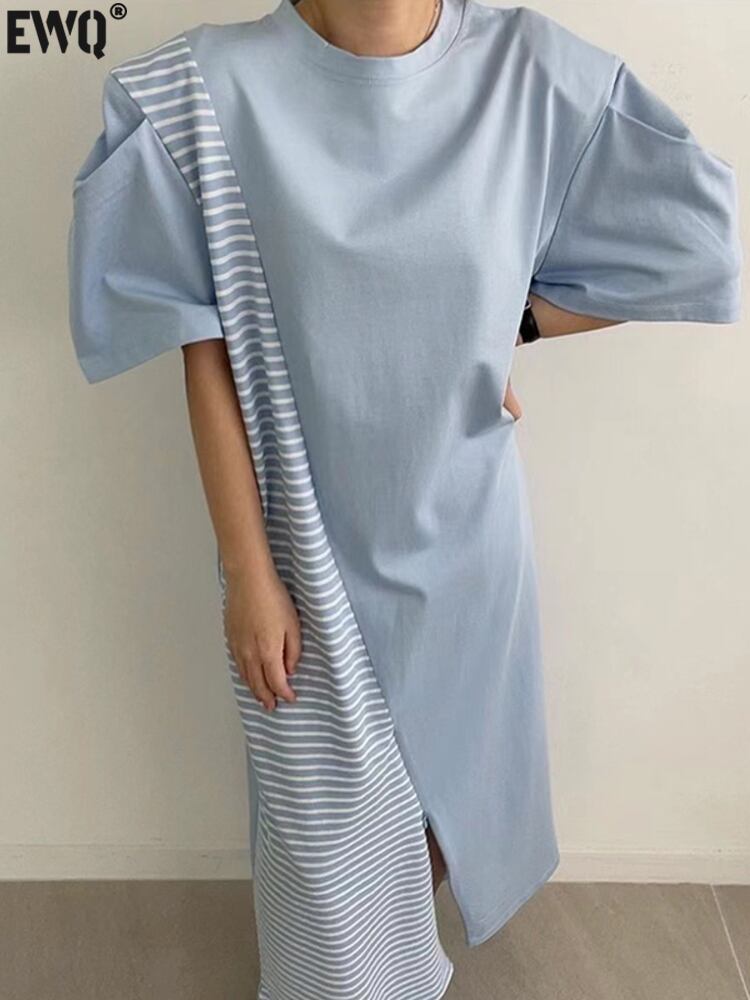 [EWQ] ストライプ パッチワーク パフ スリーブ ドレス O ネック コントラスト カラー マキシ ドレス夏 Vestido 6Y8100 サマー 夏物 Oネック