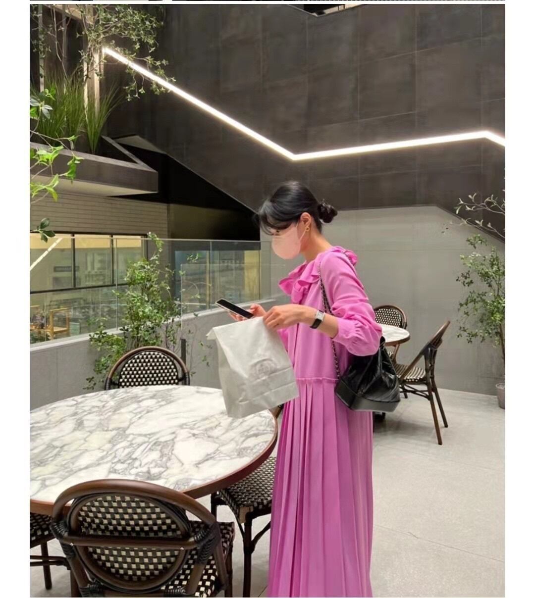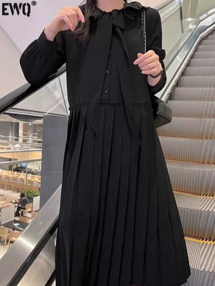 [EWQ] オフィスレディ気質レースアップボウステッチフリルゆったり長袖ドレスプリーツドレス春ルースローブ ロング リボン スプリング 春物 会社 学校 通勤や通学にも