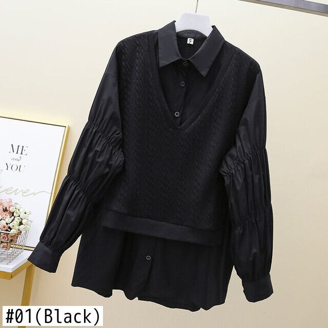 【EWQ】シックニットベスト ステッチ長袖シャツ フェイクツー レディース トップス 春 無地 ブラウス ロング スプリング 春物 ソリッドカラー