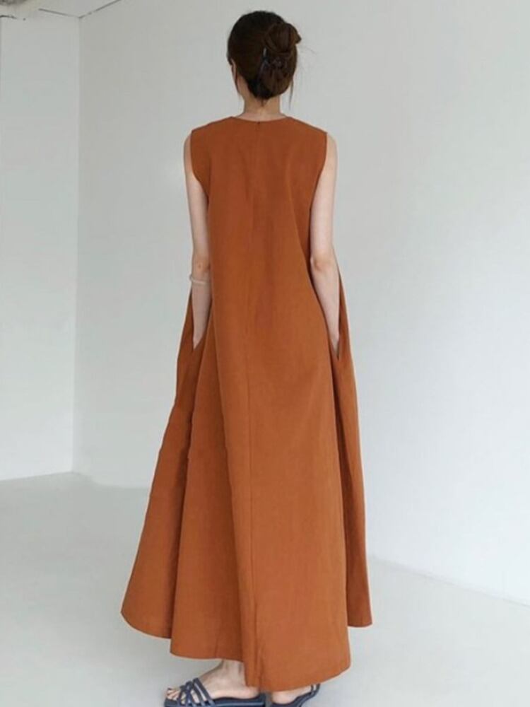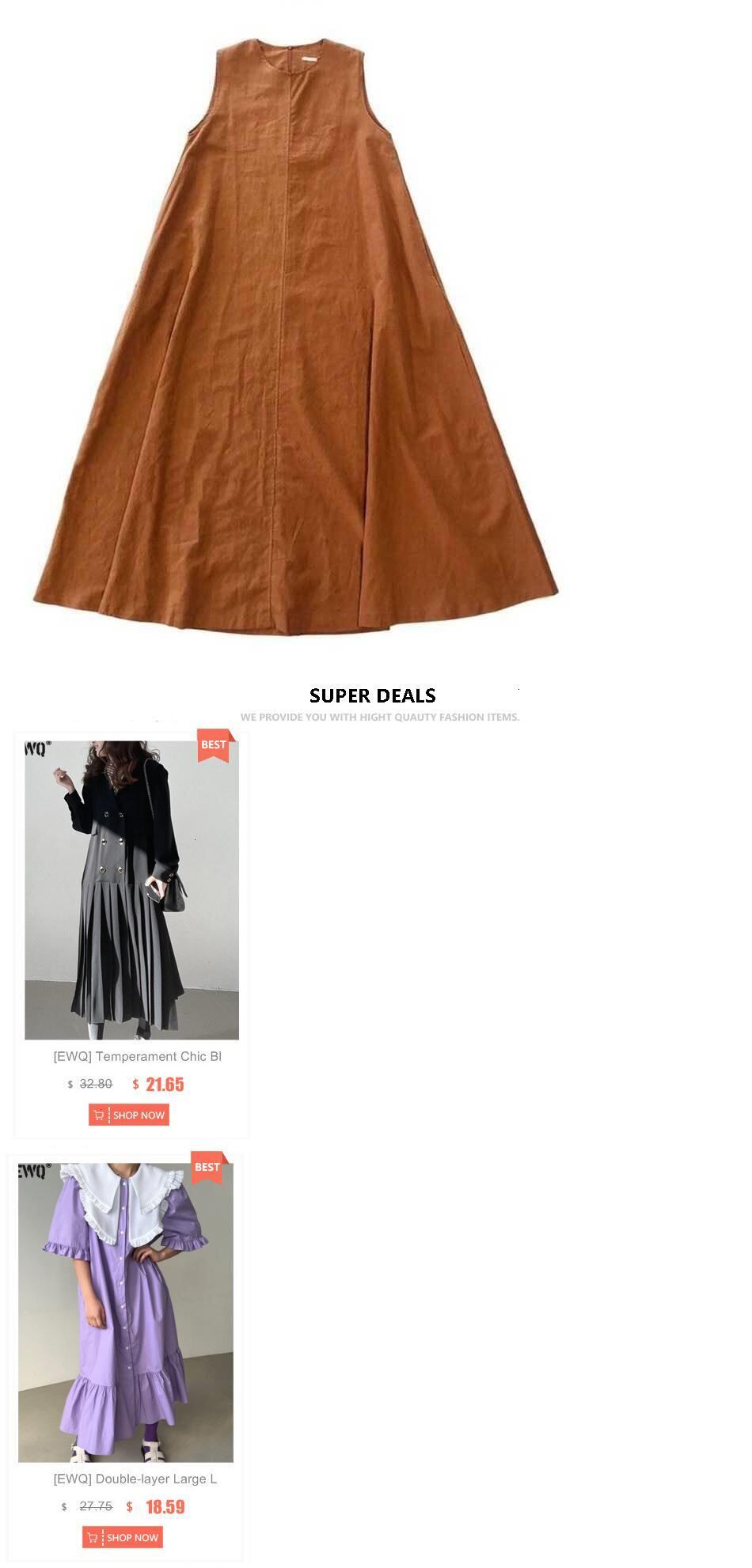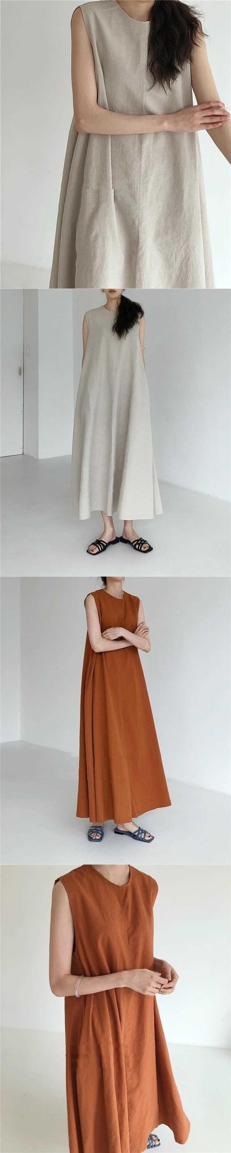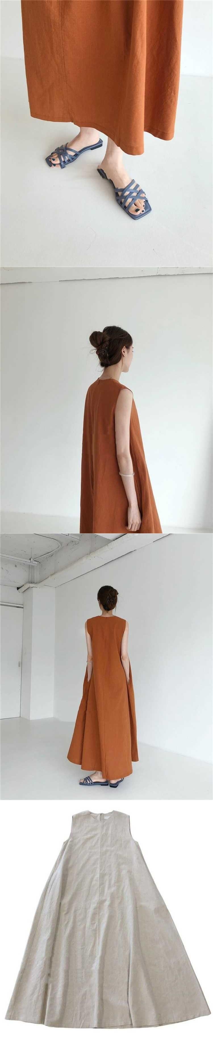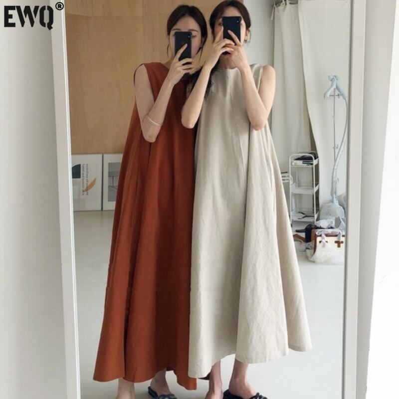 【EWQ】サマードレス シック ルーズ スイング ノースリーブ ミドル丈 コットンリネン ロングドレス ノースリーブ ウエスト レディース ランウェイドレス 夏物