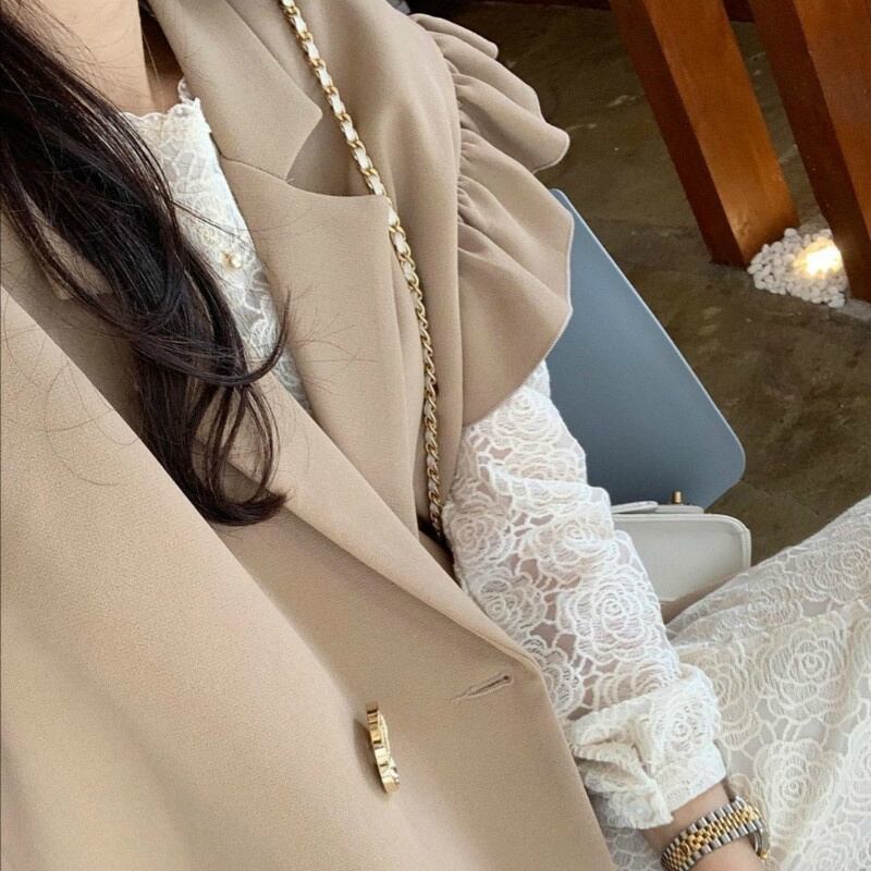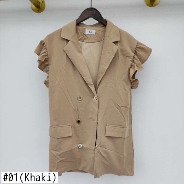[EWQ] 夏 フリル ターンダウン 襟 ルーズ カーキ ベスト オフィスレディ シンプル ジャケット シック トップス レディース コート ラッフル サマー 夏物 会社 学校 通勤や通学にも