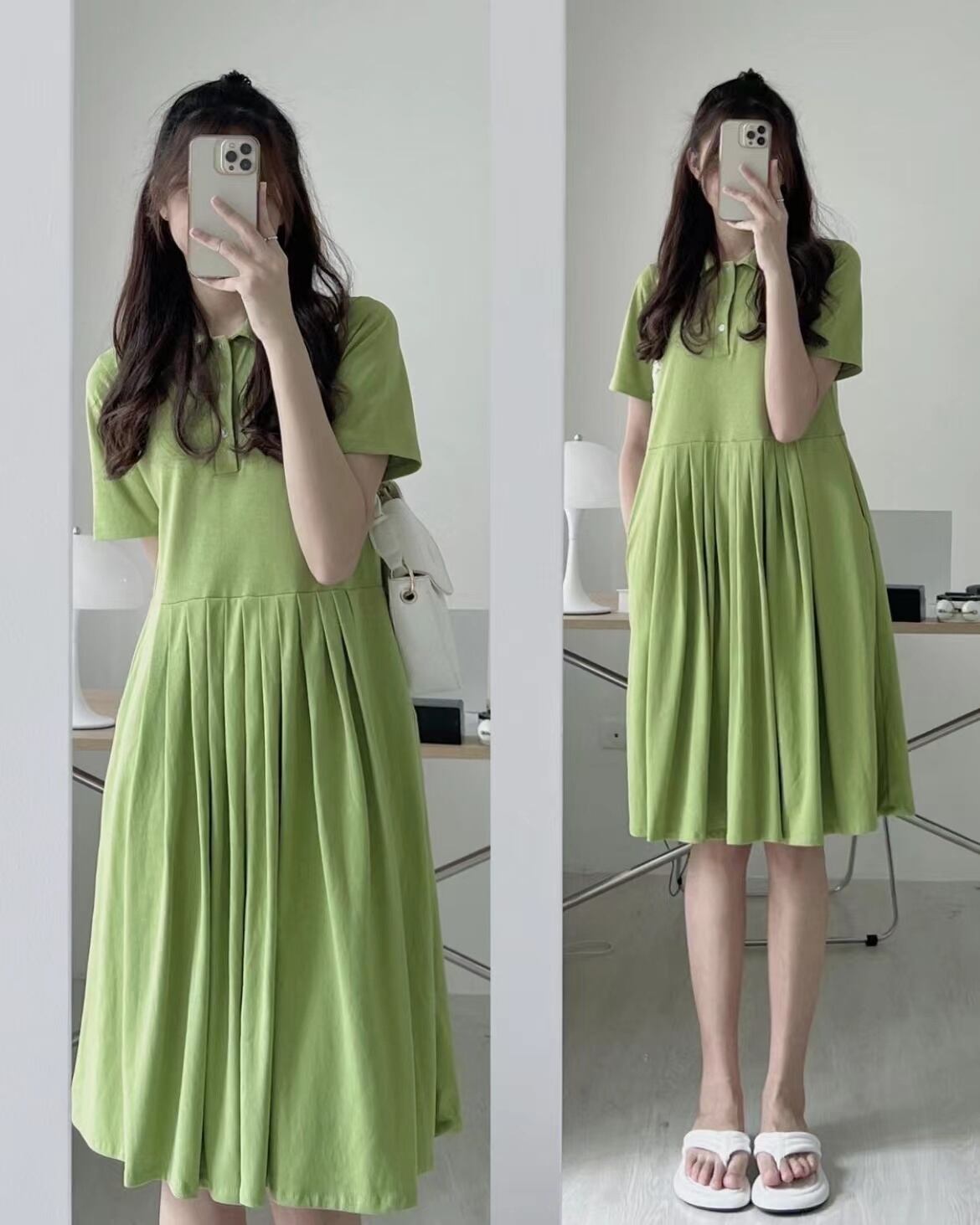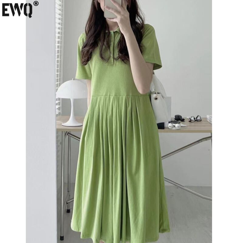 [EWQ] ターンダウンカラープリーツウエストドレス半袖無地ドレス春夏グリーン Vestido 6947 ショート ハーフスリーブ スプリング 春物 サマー 夏物 ソリッドカラー
