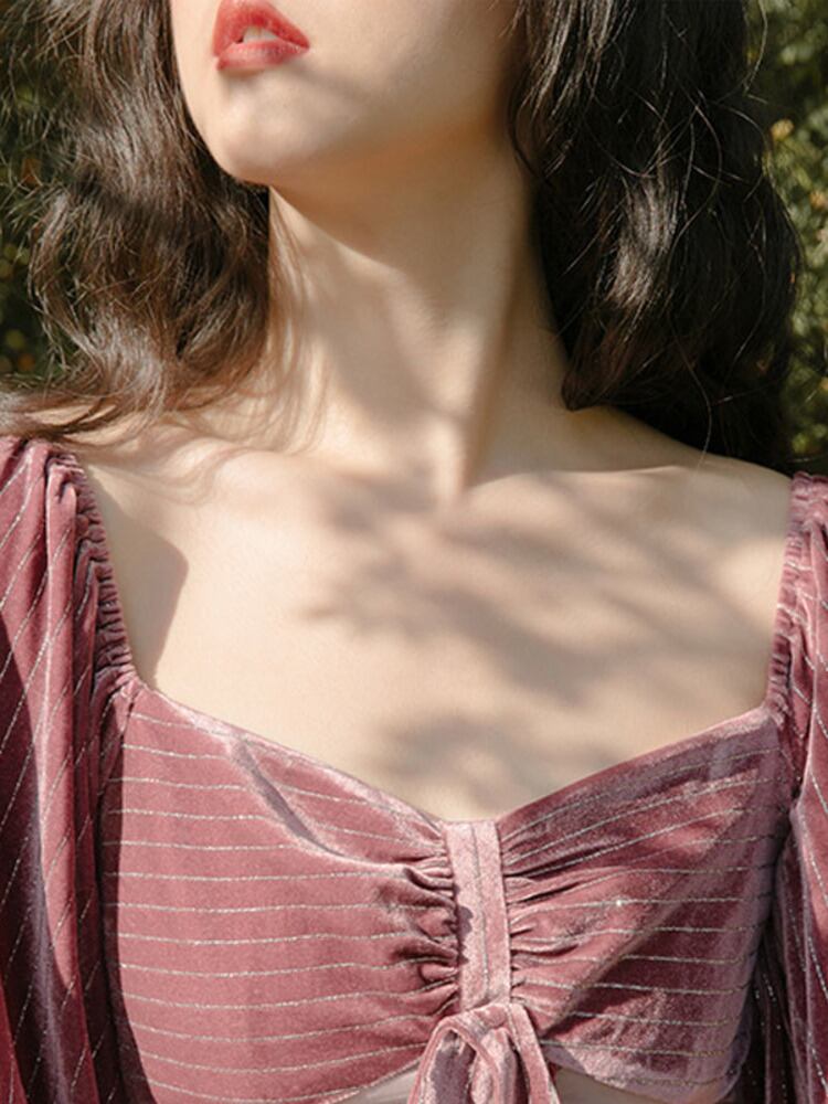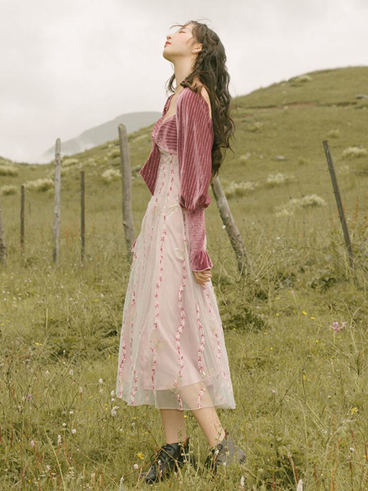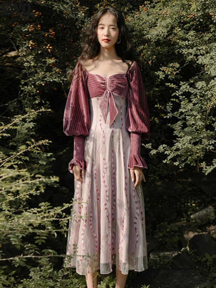 [EWQ] ランタンスリーブ ベルベット ドレス 刺繍 メッシュ ドレス 春 秋 イブニング パーティー Vestido 16Y6474 スプリング 春物 オータム 秋物
