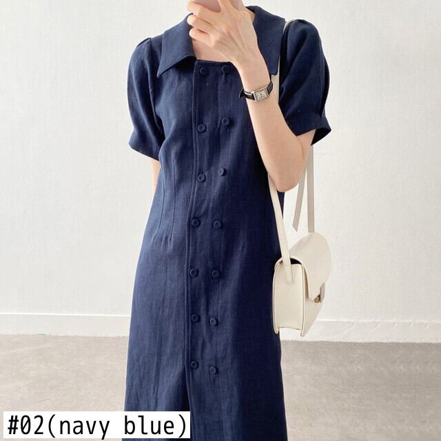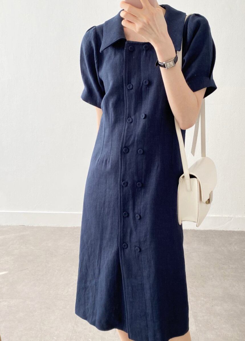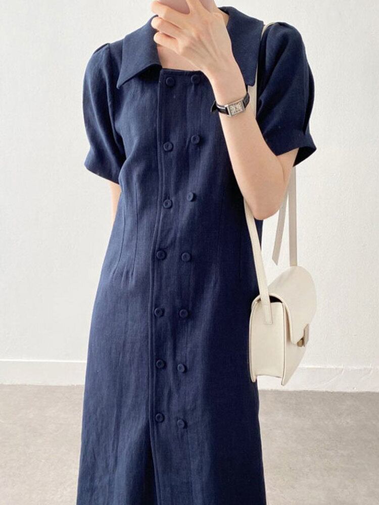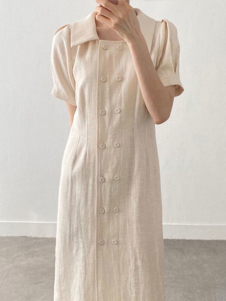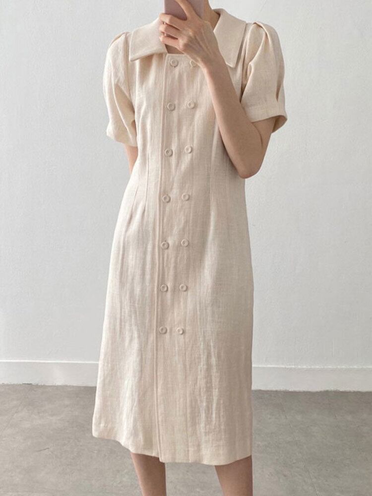 [EWQ] ラペル プリーツ ウエスト パフ スリーブ ドレス コットン ダブル ブレスト無地ドレス春夏ルース Vestido Y709 スプリング 春物 サマー 夏物 ソリッドカラー