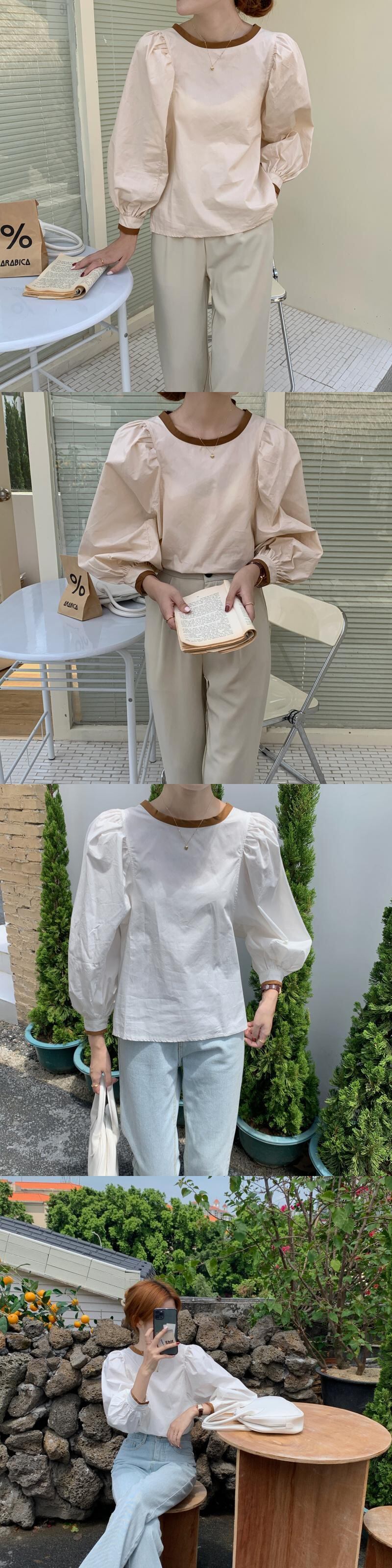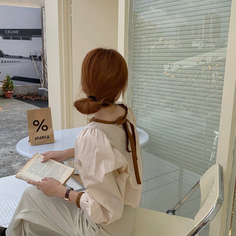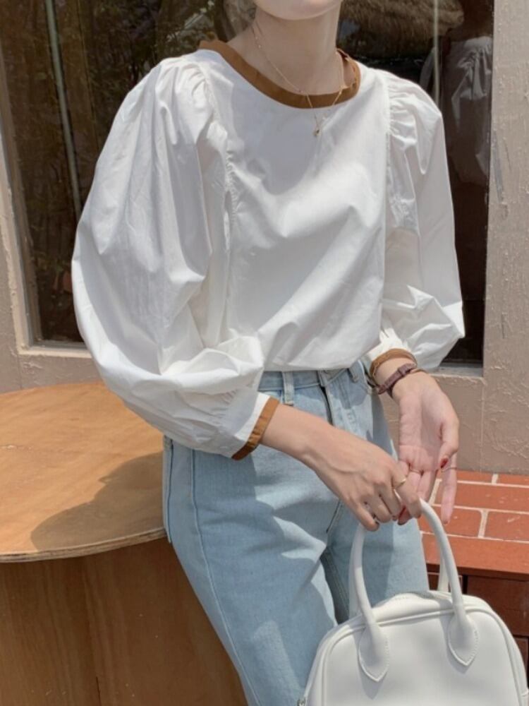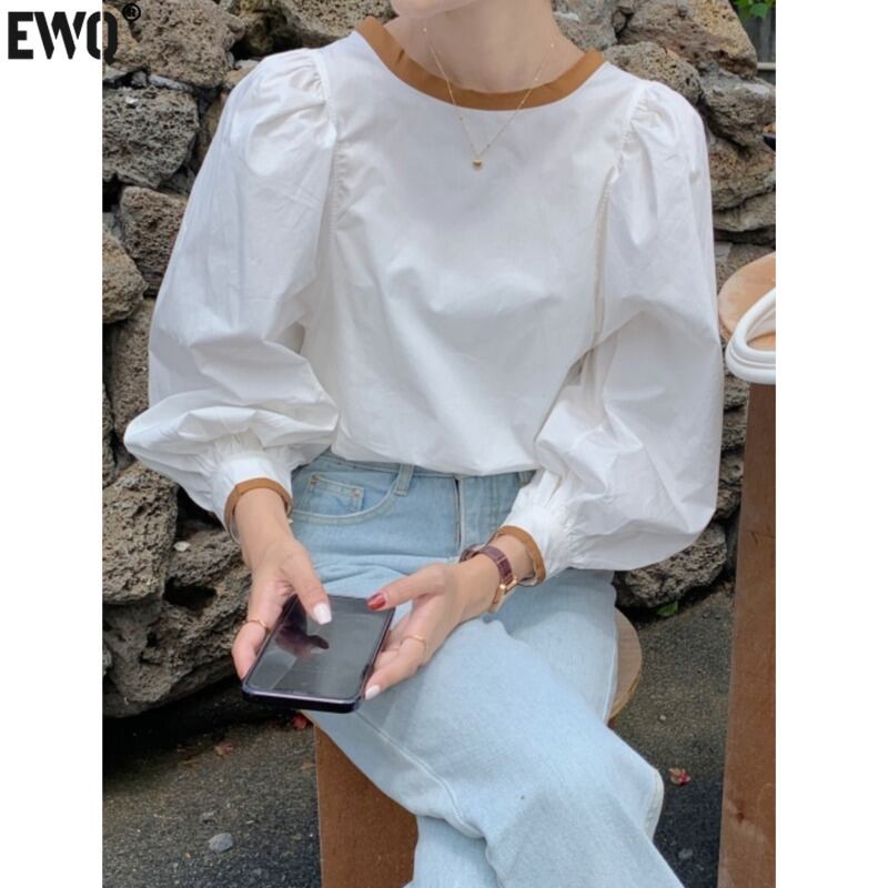 [EWQ] O ネック コントラスト ルーズ シャツプリーツ スリーブ レースアップ トップ春秋シャツ トップス 16Y6882 スプリング 春物 オータム 秋物 Oネック