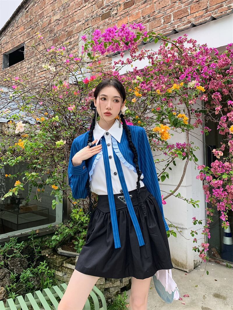 [EWQ] フェイクツーピースコントラストカラーシャツブルーストライプパッチワーク長袖春秋ブラウストップ 7599 ロング スプリング 春物 オータム 秋物