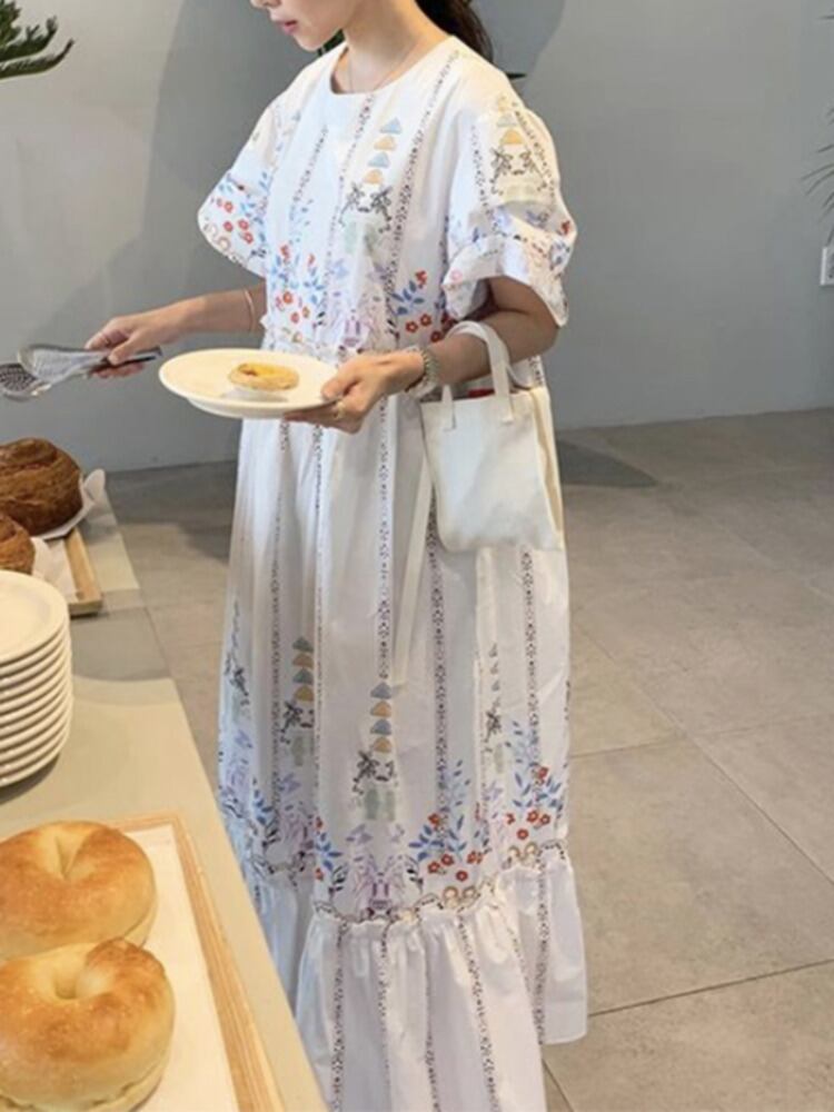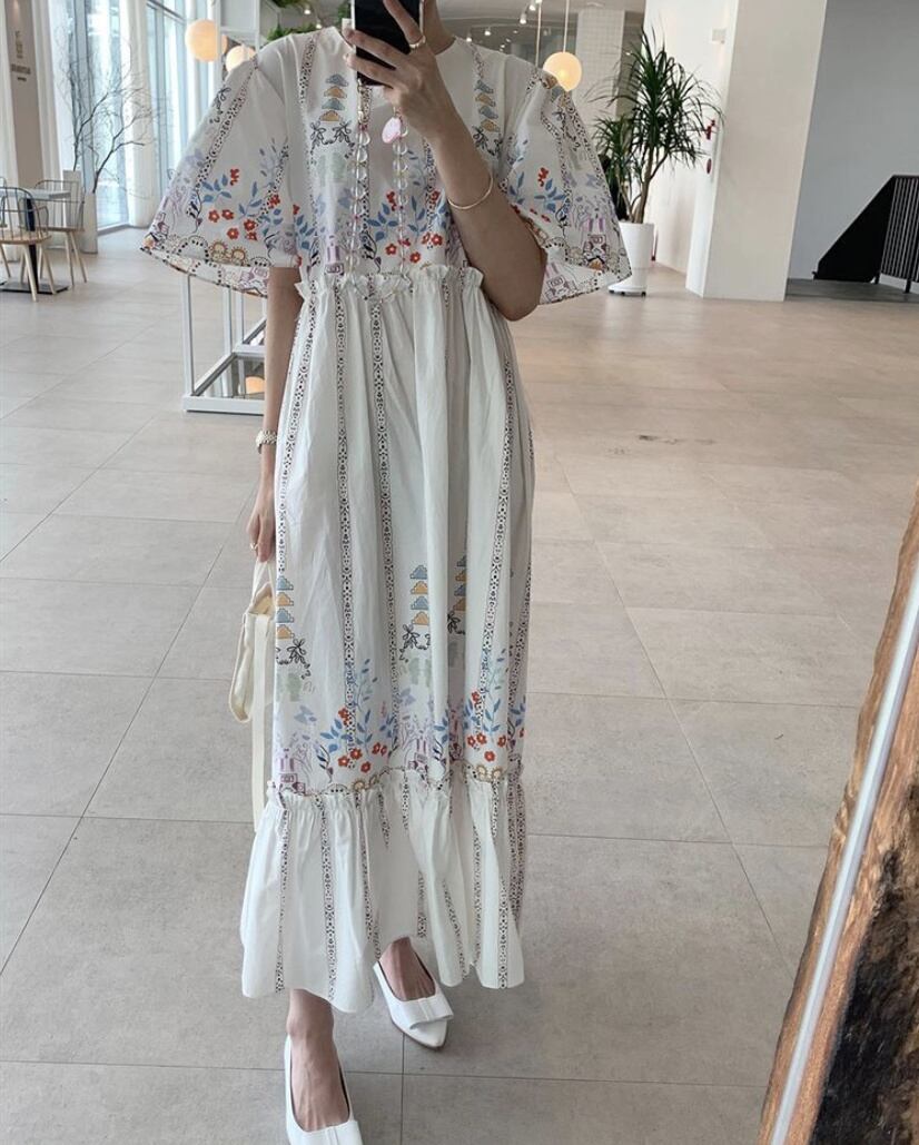 [EWQ] フリル パッチワーク ルーズ プリント ドレス半袖コントラスト ドレス春夏 Vestido ショート ハーフスリーブ スプリング 春物 サマー 夏物