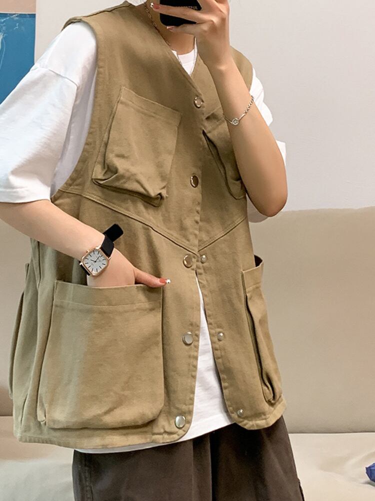 【EWQ】サファリスタイル レディース ポケット作業服 ベスト ノースリーブ ジャケット ベスト 春夏 カーキ ビッグサイズ アウター スプリング 春物 サマー 夏物