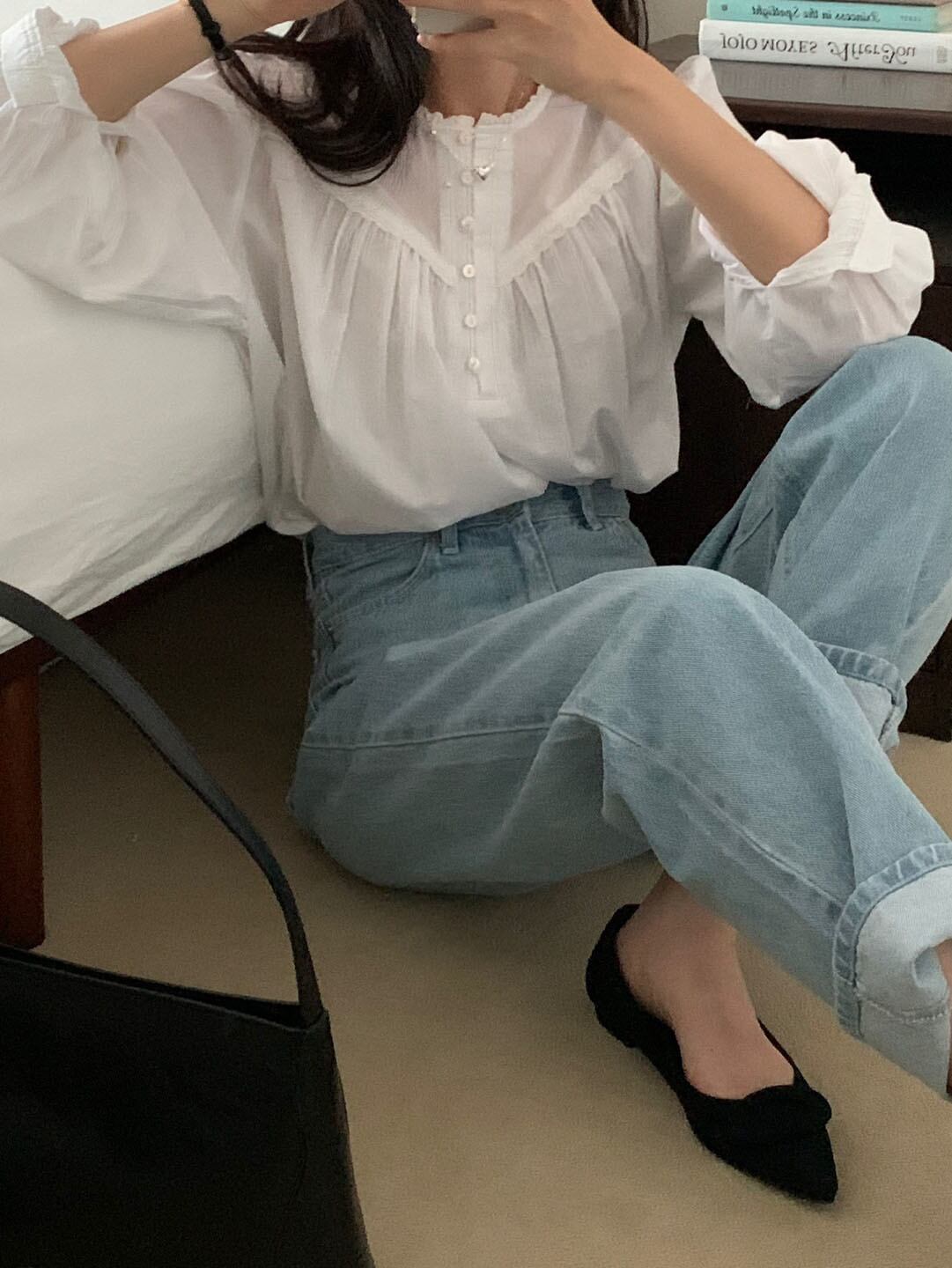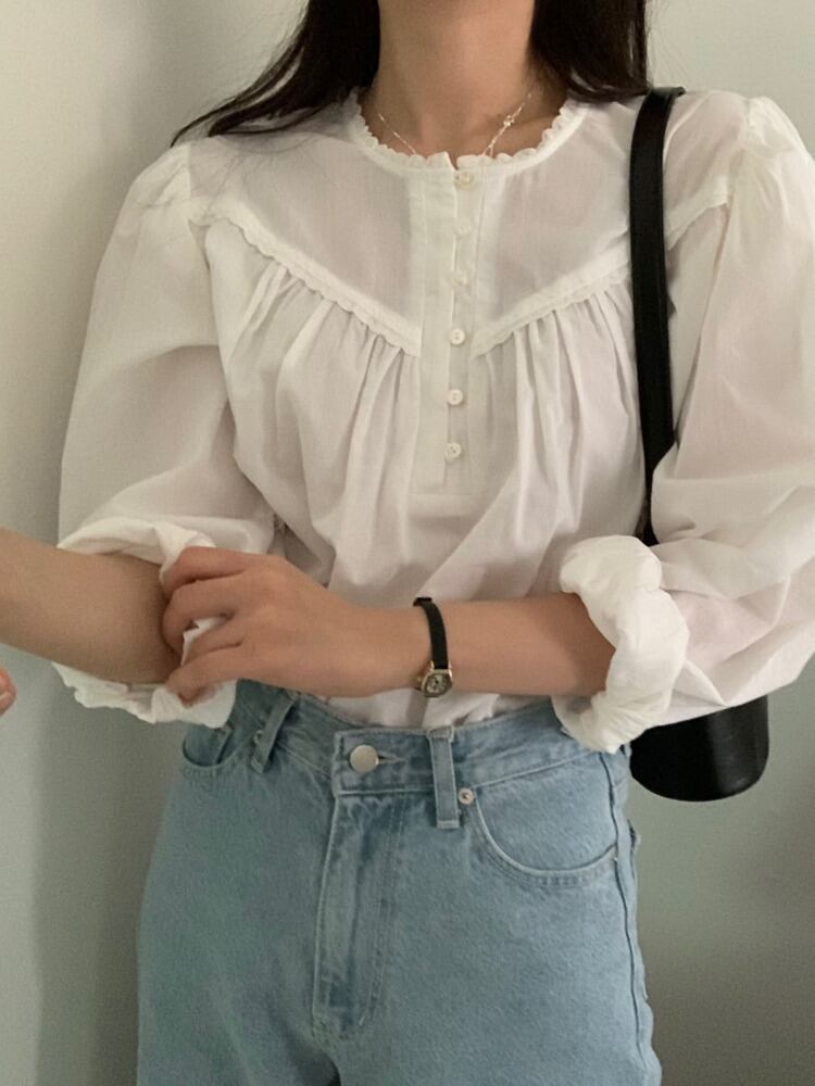 [EWQ] ソフト レース O ネック プリーツ シャツパフ スリーブ無地トップ春秋ボタン シャツ スプリング 春物 オータム 秋物 Oネック ソリッドカラー