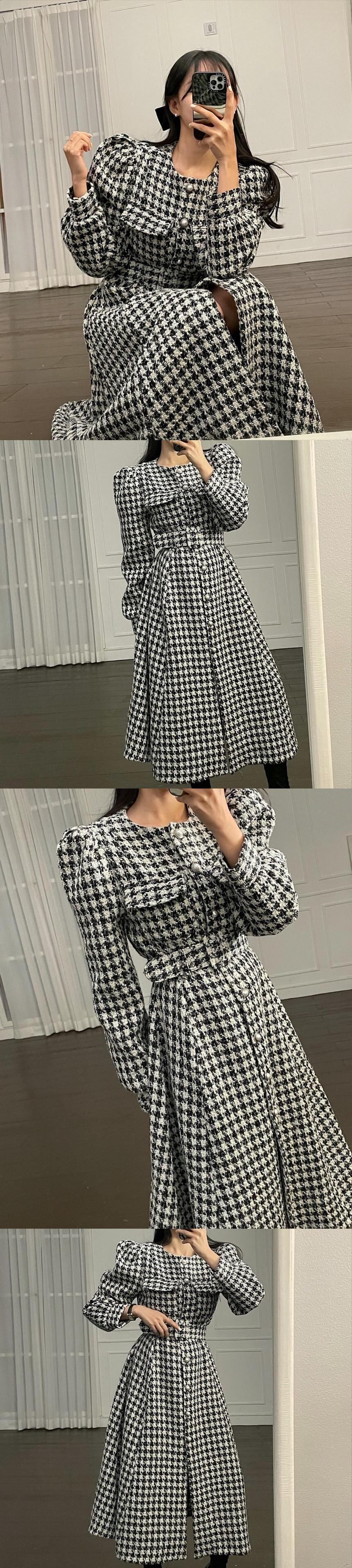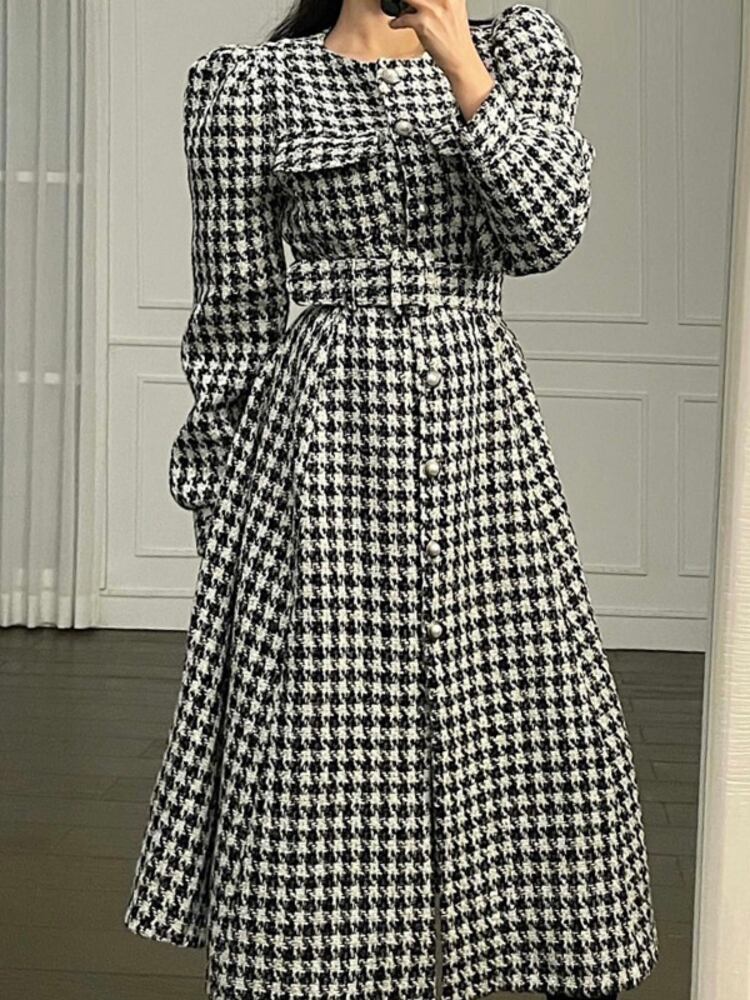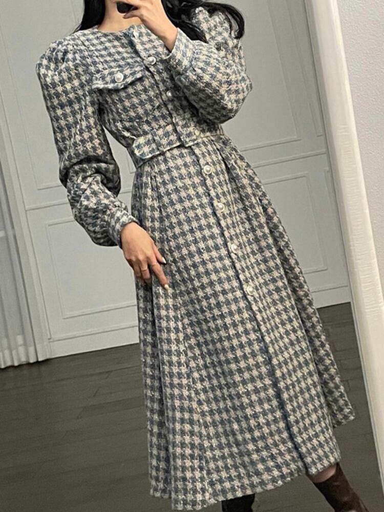 【EWQ】カラーコントラスト ツイードワンピース 春 冬 レースアップ ウエストパフスリーブ レディース パーティー ベスト スプリング 春物 ウィンター 冬物