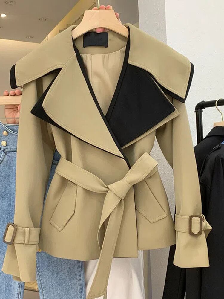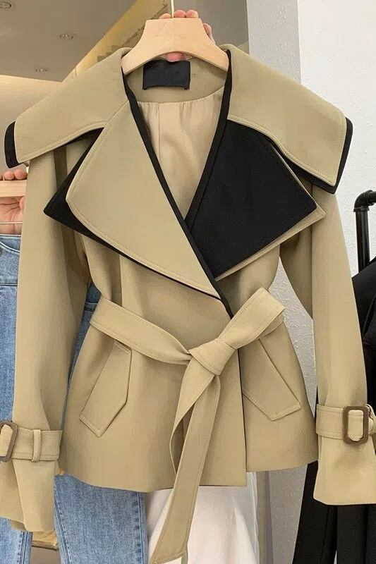 [EWQ] レディース エイブル パッチワーク ラプル ジャケット レディース レースアップ 長袖 ショート ジャケット コート 春 秋 コントラスト トップス ロング スプリング 春物 オータム 秋物