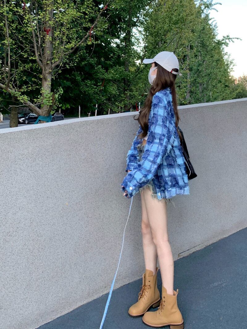 [EWQ] Tels コントラストチェック柄シャツ長袖ポケットシックブラウス春秋ブルートップス 595 ロング スプリング 春物 オータム 秋物