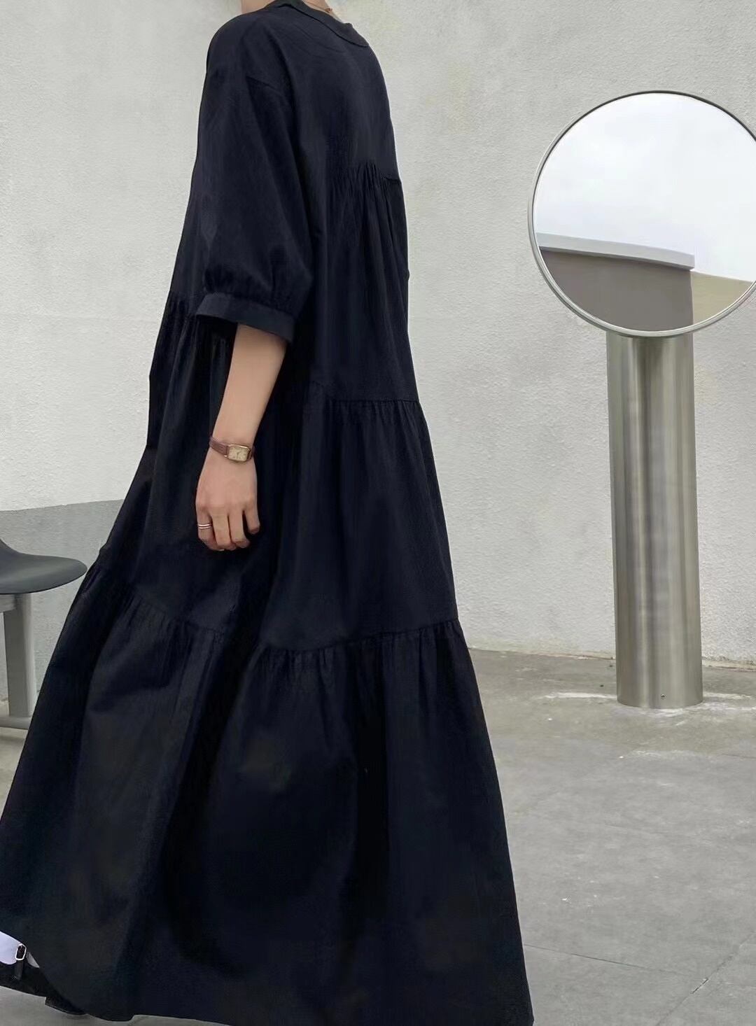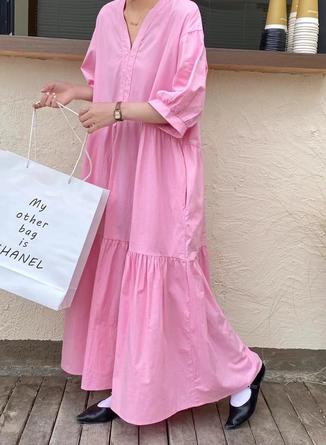 [EWQ] フリル継ぎ無地ドレス半袖シンプル V ネックゆったりプリーツ ドレス夏 Rode 6Y7628 ショート ハーフスリーブ サマー 夏物 Vネック ソリッドカラー